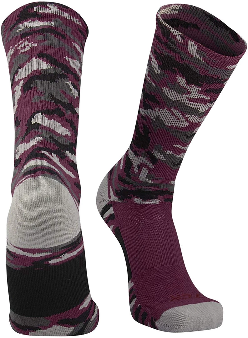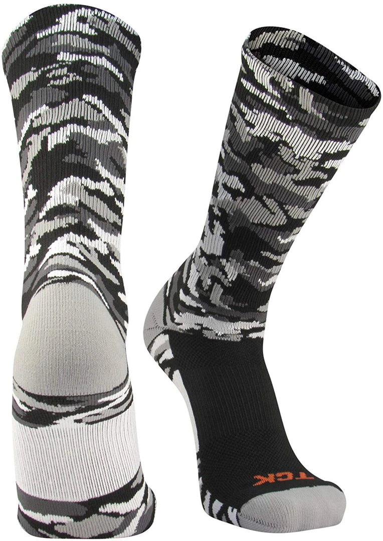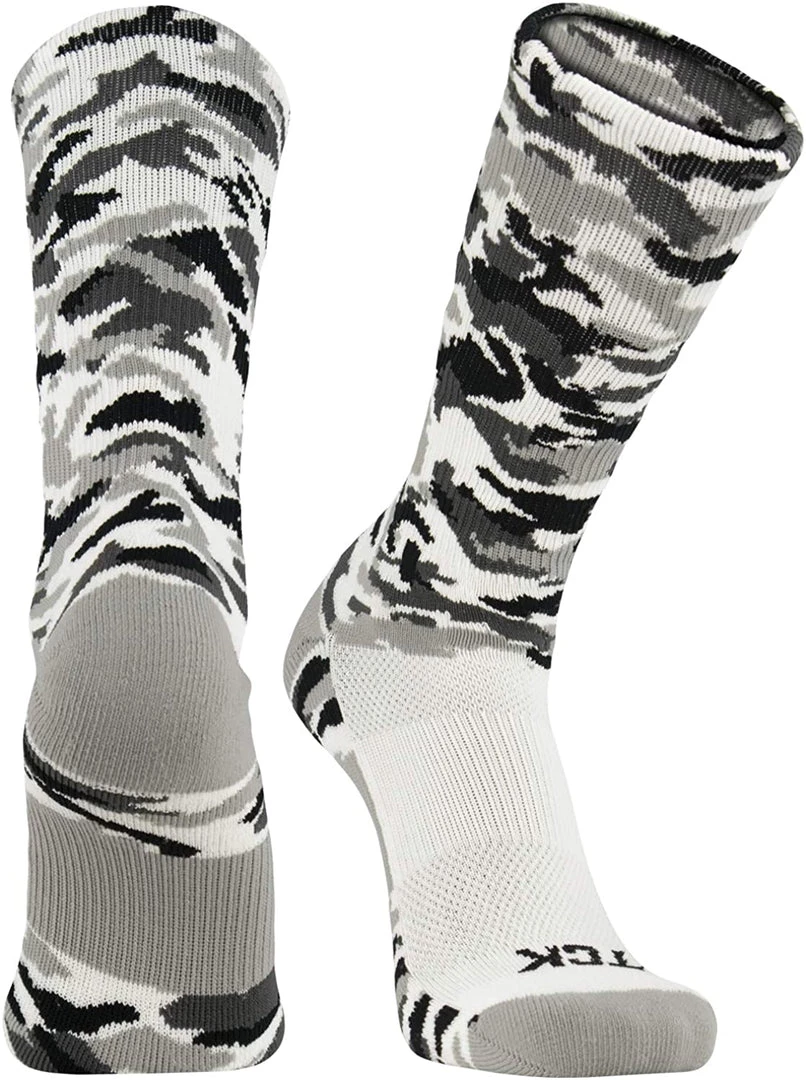 TCK Sports Elite Woodland Camouflage Performance Crew Socks. High performance, moisture wicking, blister control, odor control, athletic crew socks for all team sports and elite athletes. Fit goes by shoe size: Small fits Youth 12-5; Medium fits Mens 6-9 or Womens 7-10; Large fits Mens 9-12 or Womens 10-13; X-Large fits Mens 12-15 or Womens 13+. High quality fiber contents: 77% Polypropylene, 17% Nylon, 3% Elastic, 3% Lycra Spandex. Made in USA.