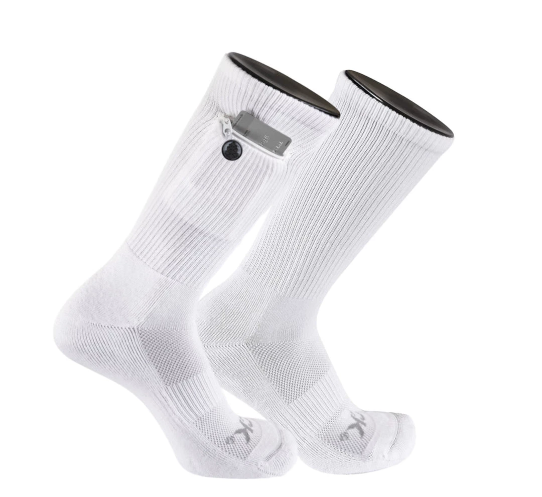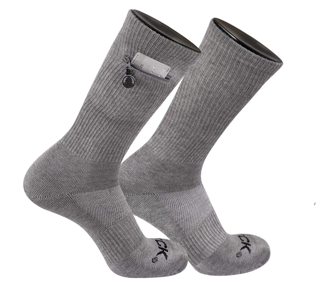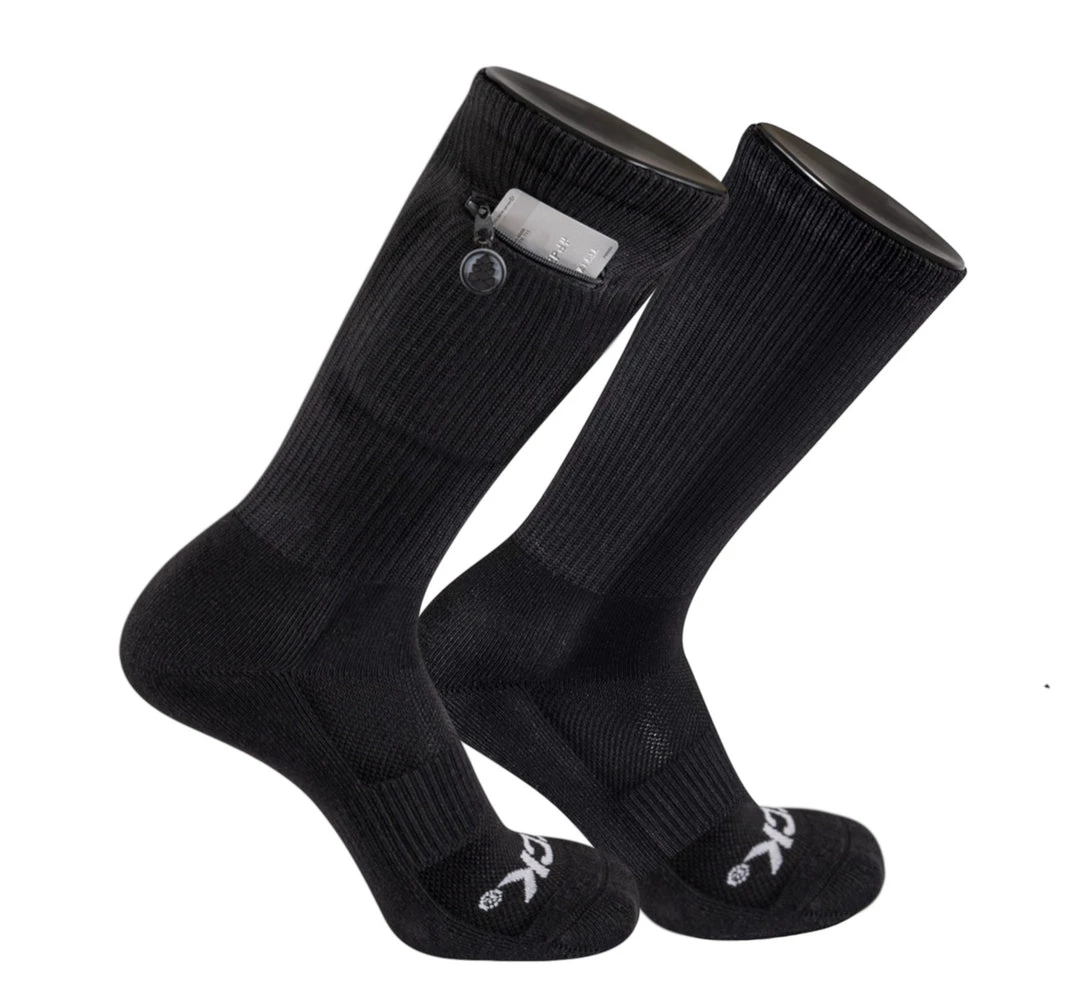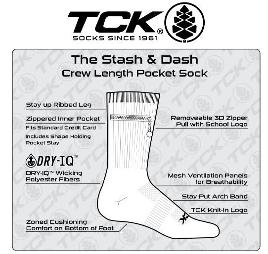TCK Stash & Dash – A high performance crew socks with a pocket. Brilliant. Stash away secret goodies with a secure zip pocket within the sock leg. These socks are great for travel and events. Each pair comes with 1 pocket sock and 1 basic high performance sock. With zoned cushioning, stay put compression arch band, mesh upper panels, and dry IQ wicking, your feet will say Thank You. Designed for performance, style, & comfort. Made of 96% Polyester, 3% Rubber, 1% Spandex.