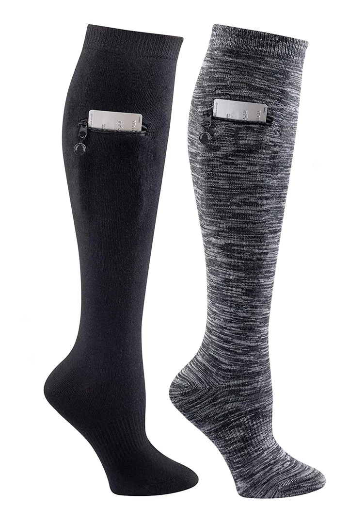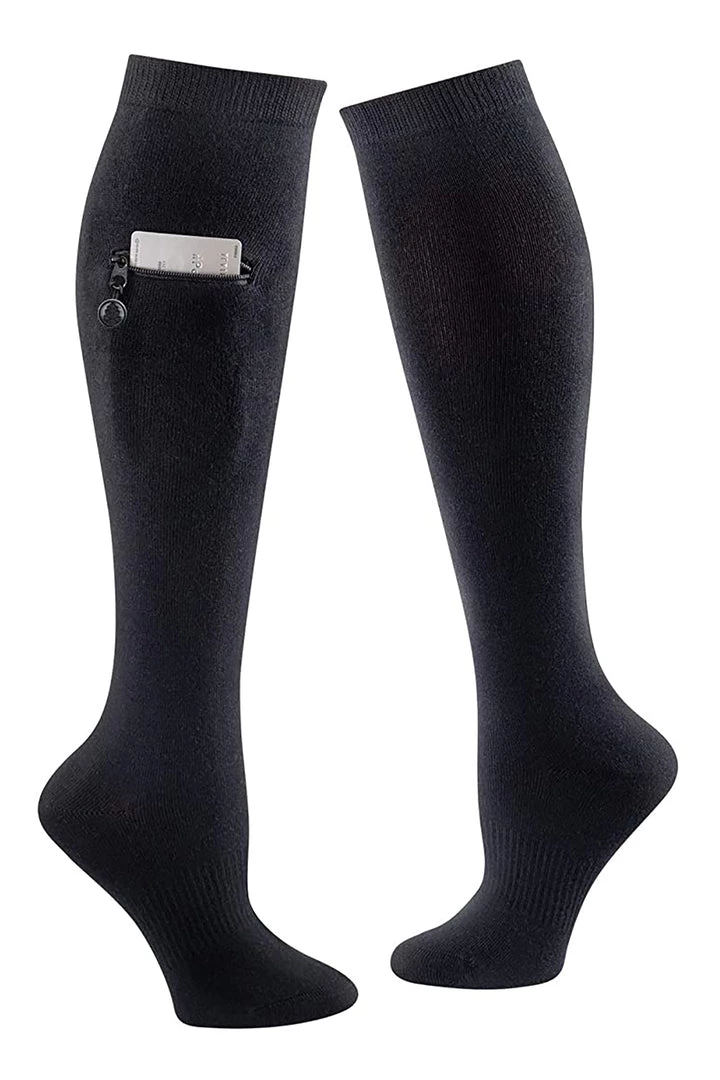 - POCKET KNEE HIGH SOCKS: Each pair of over the calf TCK zipper socks come with 1 pocket sock and 1 regular sock! Zippered inner pocket is perfect for keeping small stashes safe, including cash, credit cards, keys, golf tees, ID, hotel key, lip balm, and other items. The zipper pocket does not hold a cell phone.