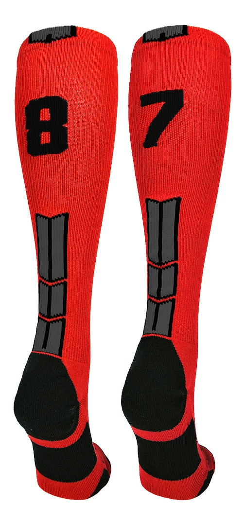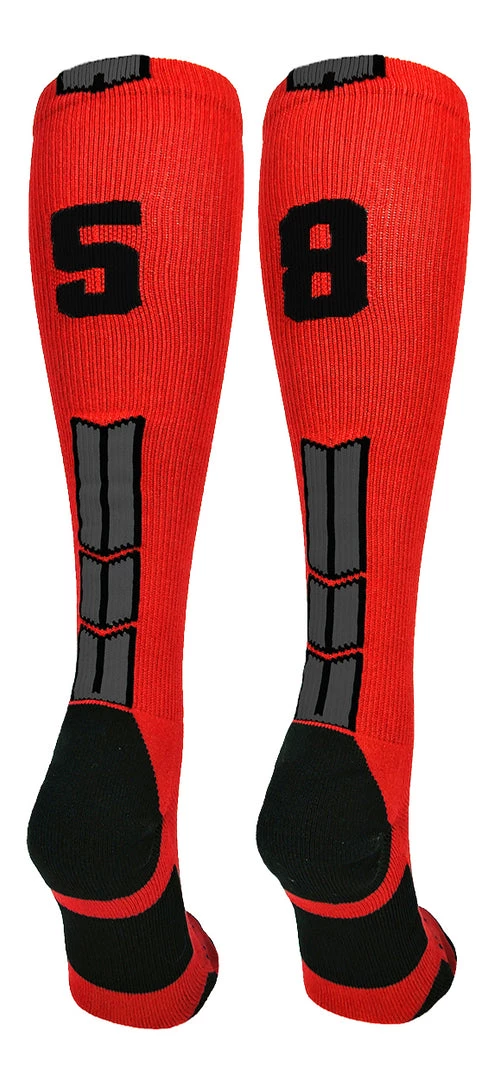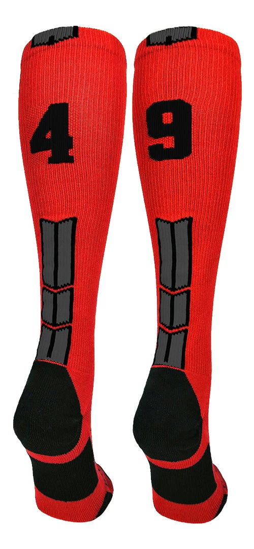 NUMBER SOCKS SOLD AS A PAIR!! MadSportsStuff Player Id Jersey Number Socks Over the Calf Length Red and White. Select your own personalized jersey number. High performance athletic number socks for all team sports and elite athletes. These jersey number socks are ideal for boys and girls and are great for soccer, football, baseball, softball, basketball, volleyball, lacrosse and more!