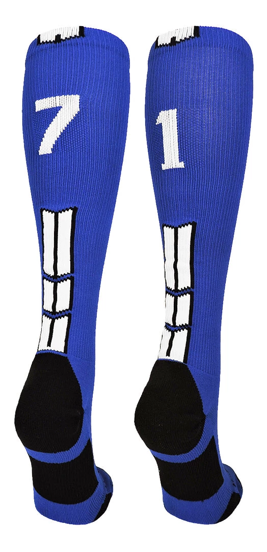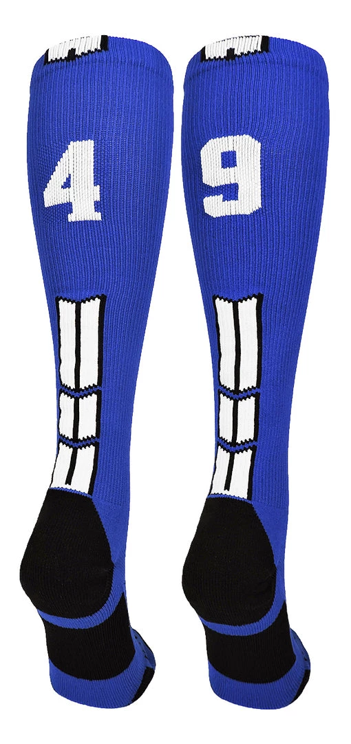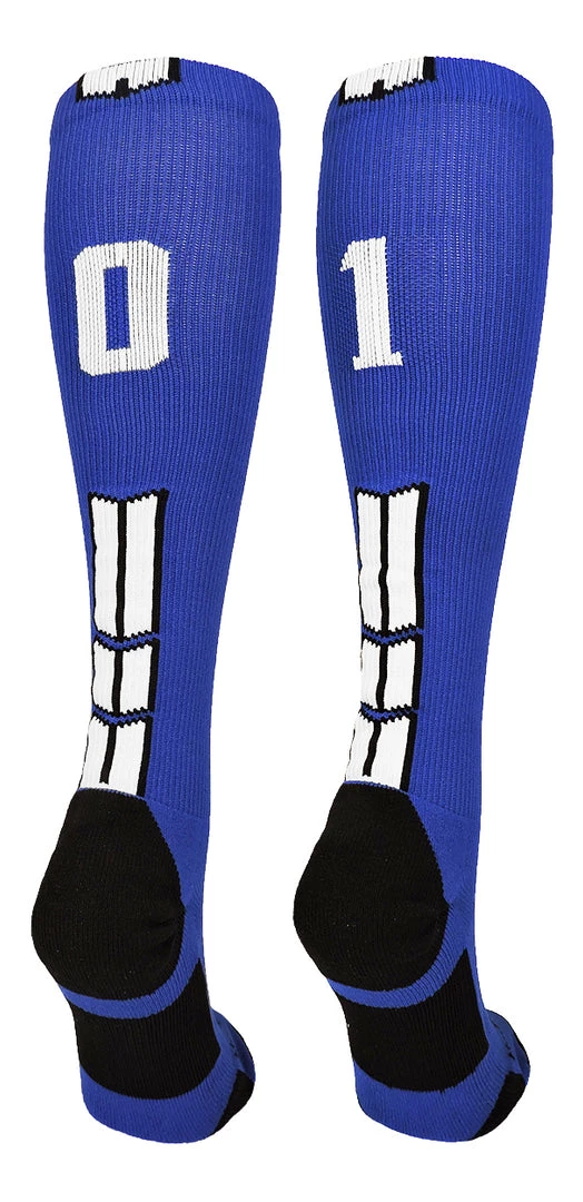 NUMBER SOCKS SOLD AS A PAIR!! MadSportsStuff Player Id Jersey Number Socks Over the Calf Length Royal and White. Select your own personalized jersey number. High performance athletic number socks for all team sports and elite athletes. These jersey number socks are ideal for boys and girls and are great for soccer, football, baseball, softball, basketball, volleyball, lacrosse and more!