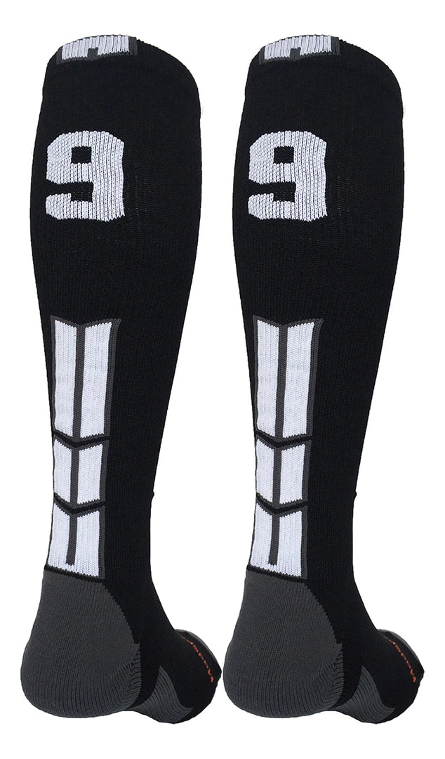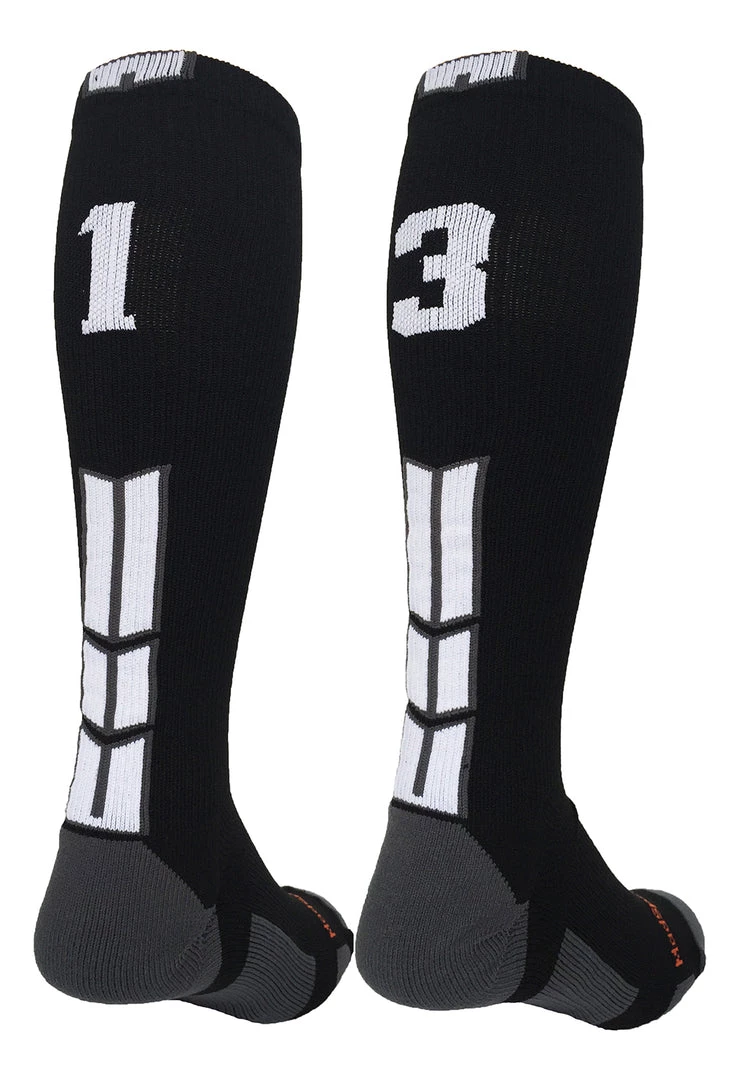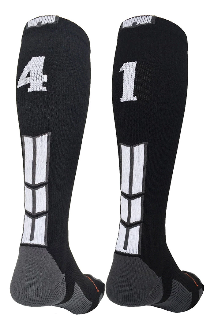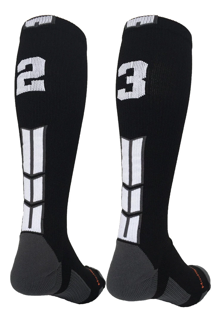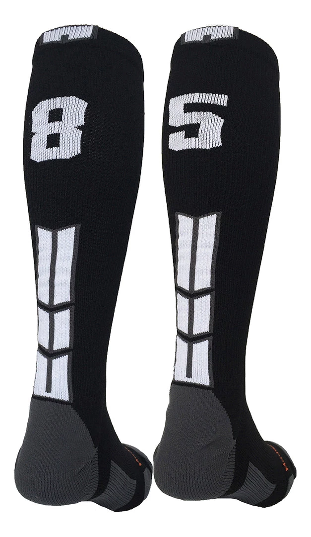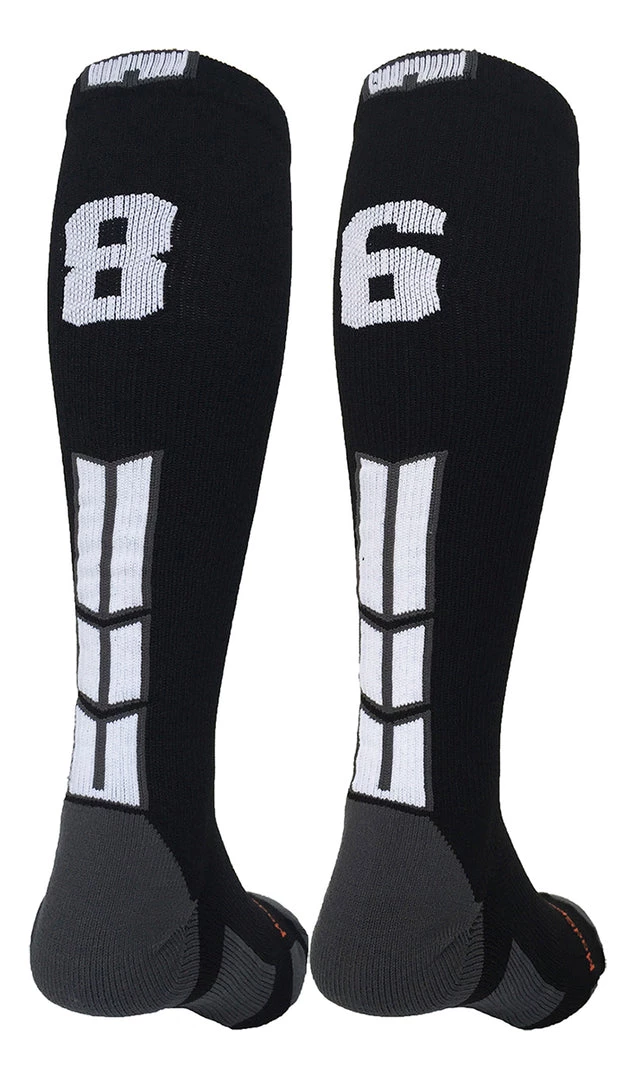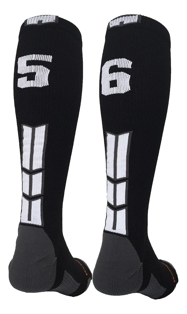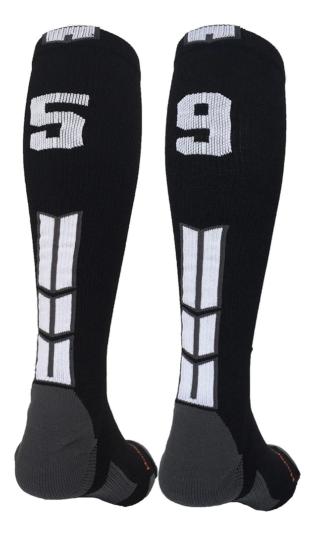 NUMBER SOCKS SOLD AS A PAIR!! MadSportsStuff Player Id Jersey Number Socks Over the Calf Length Black and White. Select your own personalized jersey number. High performance athletic number socks for all team sports and elite athletes. These jersey number socks are ideal for boys and girls and are great for soccer, football, baseball, softball, basketball, volleyball, lacrosse and more!