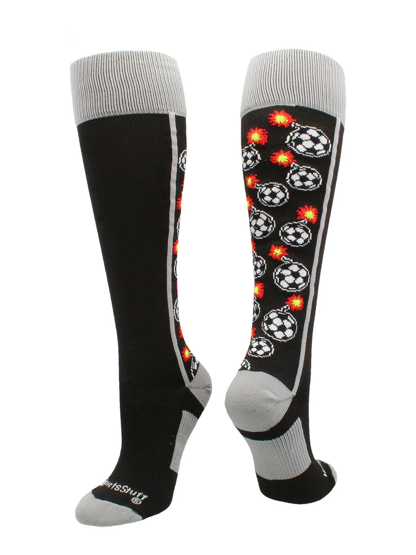 - PERFECT SOCCER SOCKS: These soccer socks have soccer balls shaped as bombs, lit up, in an over the calf length. Great for teams such as Bombers Soccer, Soccer Bombers, Soccer Bombs, Firecrackers, or for some super fun, crazy socks to light up the field.