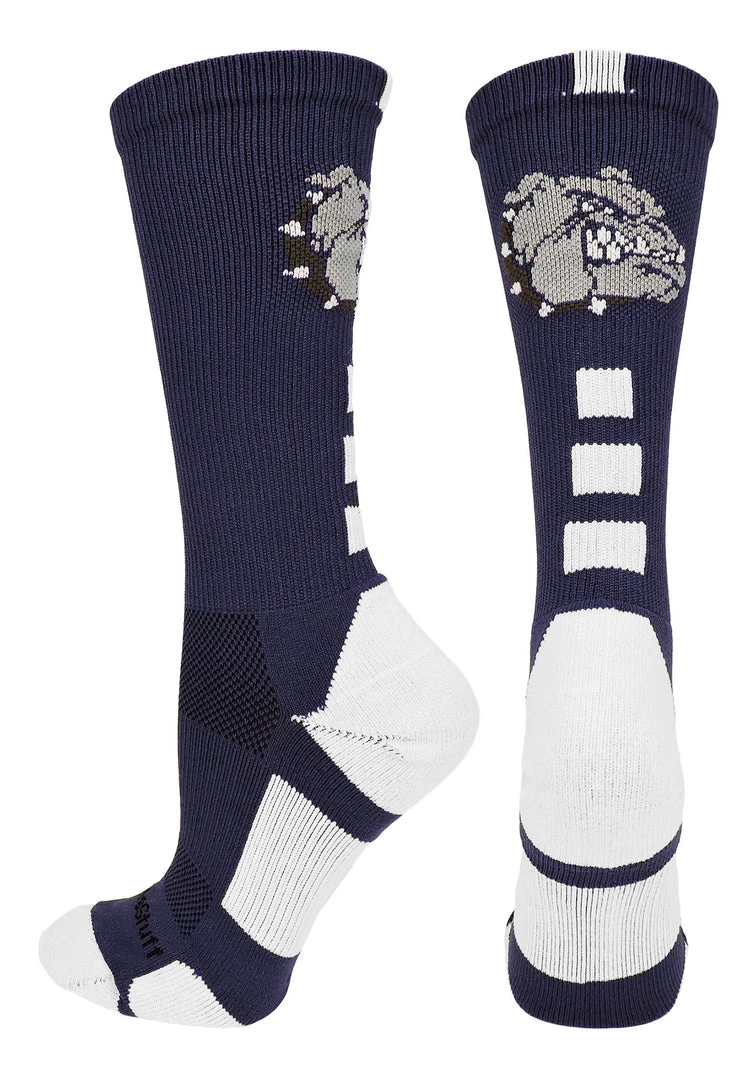 MadSportsStuff Bulldogs Logo Athletic Crew Socks. High performance athletic socks for all team sports and elite athletes. Our Bulldog socks are ideal for softball, baseball, lacrosse, basketball, field hockey, volleyball, wrestling, soccer, football, cheer, kickball and more!