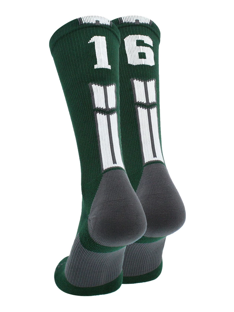 NUMBER SOCKS SOLD AS A PAIR!! MadSportsStuff Player Id Jersey Number Socks Crew Length Dark Green and White. Select your own personalized jersey number. High performance athletic number socks for all team sports and elite athletes. These jersey number socks are ideal for boys and girls and are great for basketball, football, volleyball, lacrosse and more!