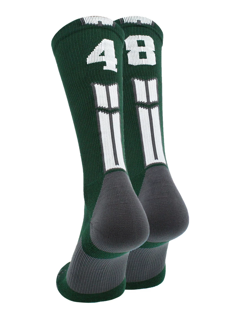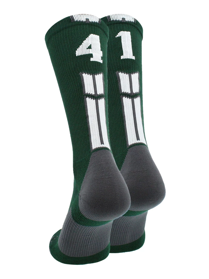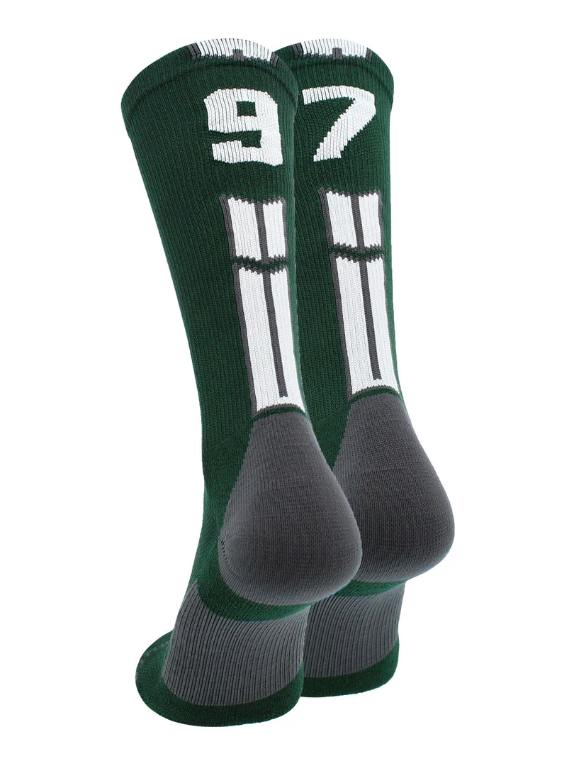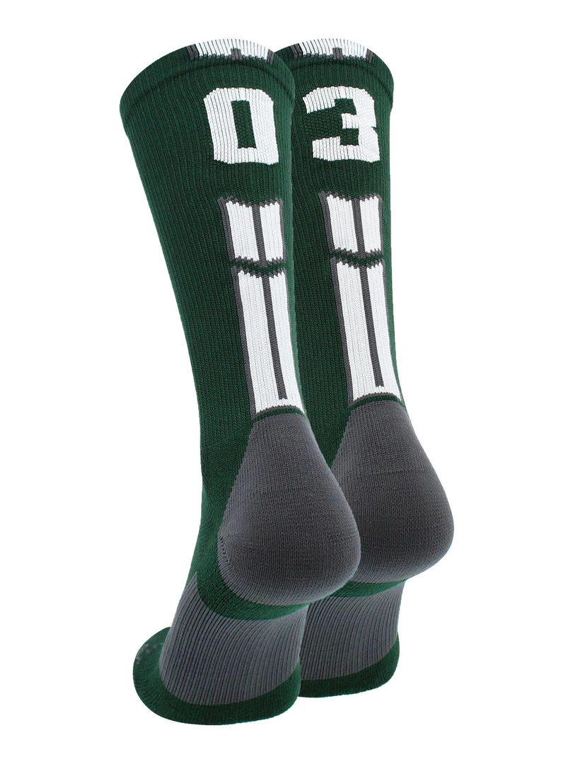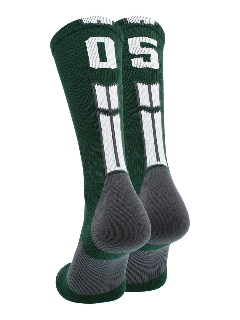 NUMBER SOCKS SOLD AS A PAIR!! MadSportsStuff Player Id Jersey Number Socks Crew Length Dark Green and White. Select your own personalized jersey number. High performance athletic number socks for all team sports and elite athletes. These jersey number socks are ideal for boys and girls and are great for basketball, football, volleyball, lacrosse and more!