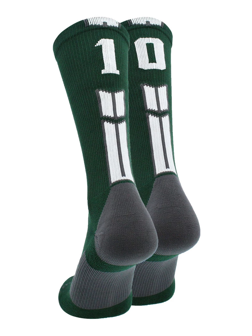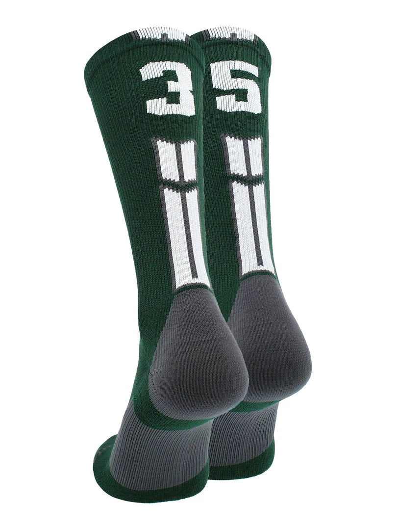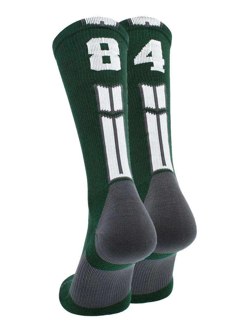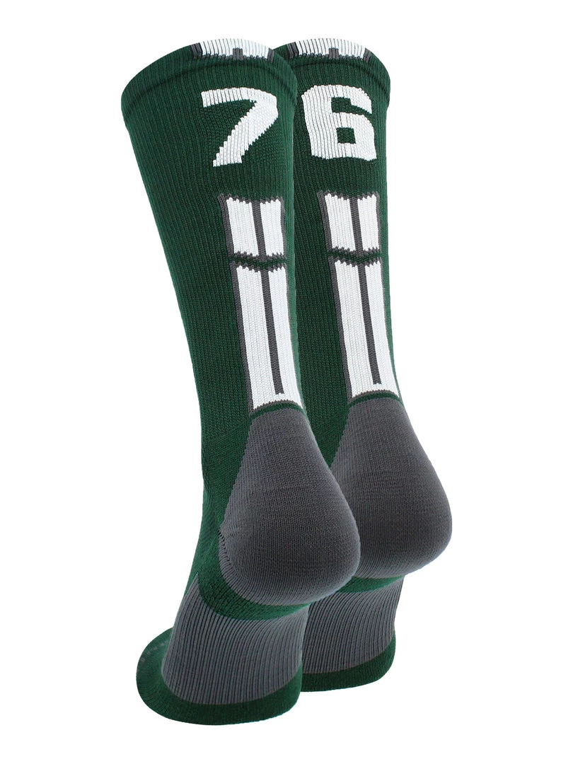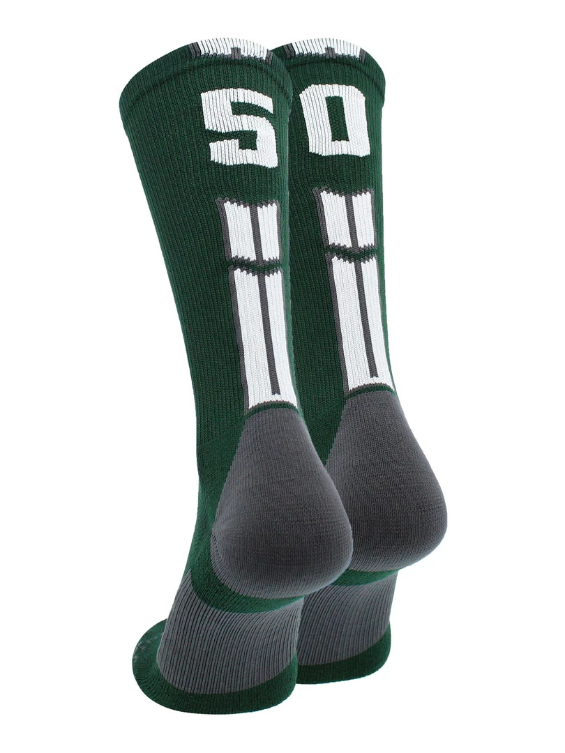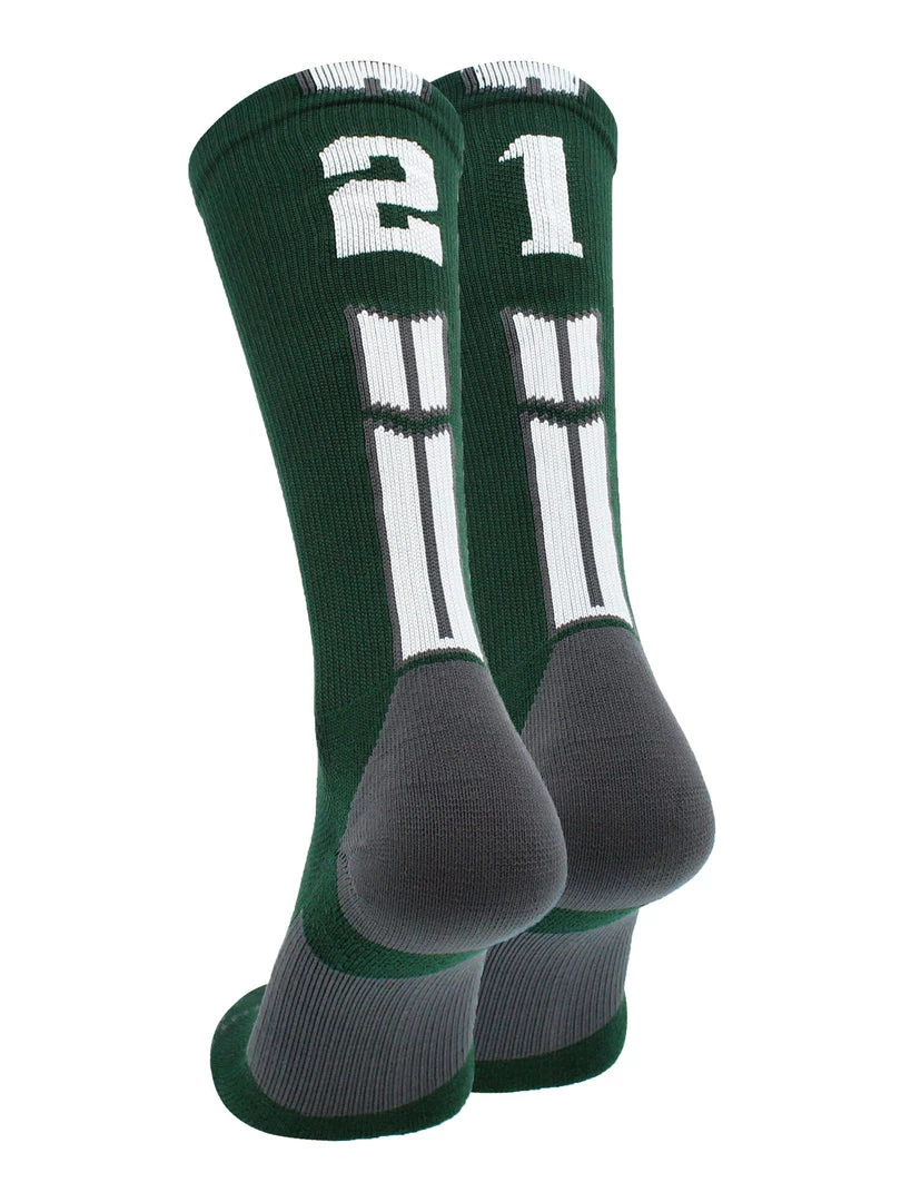 NUMBER SOCKS SOLD AS A PAIR!! MadSportsStuff Player Id Jersey Number Socks Crew Length Dark Green and White. Select your own personalized jersey number. High performance athletic number socks for all team sports and elite athletes. These jersey number socks are ideal for boys and girls and are great for basketball, football, volleyball, lacrosse and more!