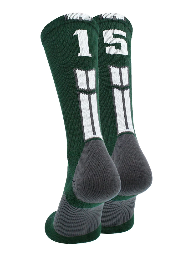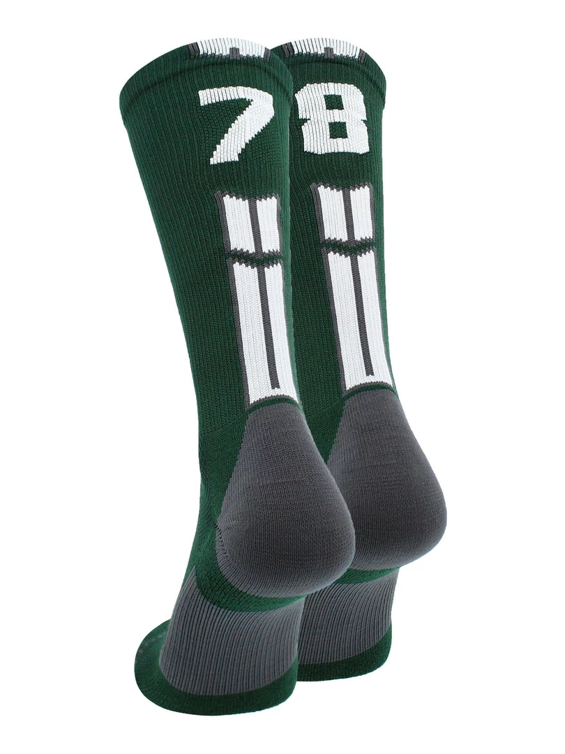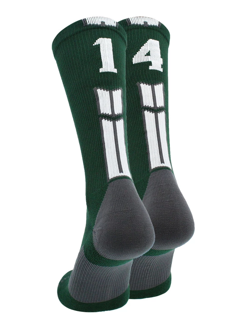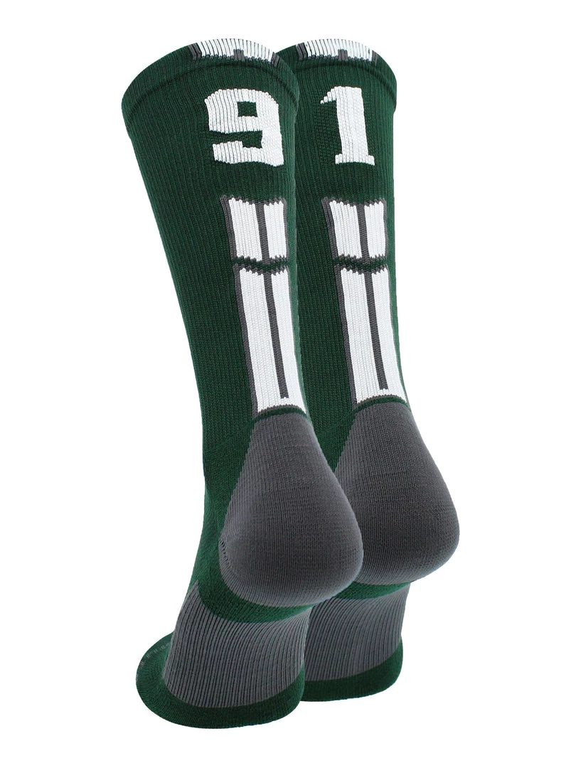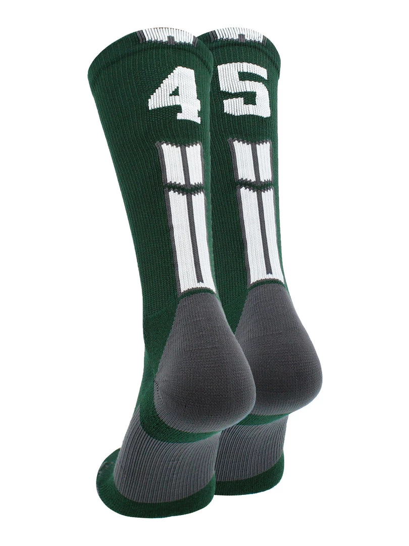 NUMBER SOCKS SOLD AS A PAIR!! MadSportsStuff Player Id Jersey Number Socks Crew Length Dark Green and White. Select your own personalized jersey number. High performance athletic number socks for all team sports and elite athletes. These jersey number socks are ideal for boys and girls and are great for basketball, football, volleyball, lacrosse and more!
