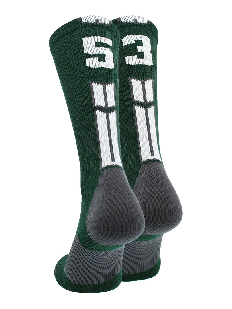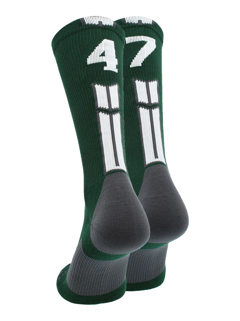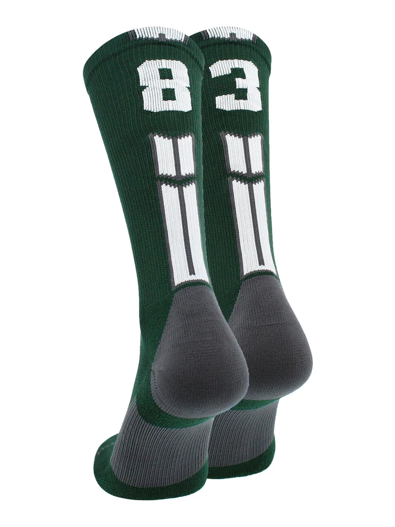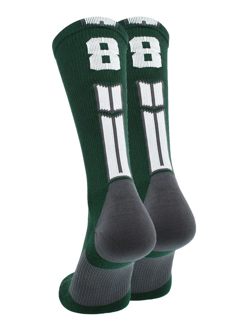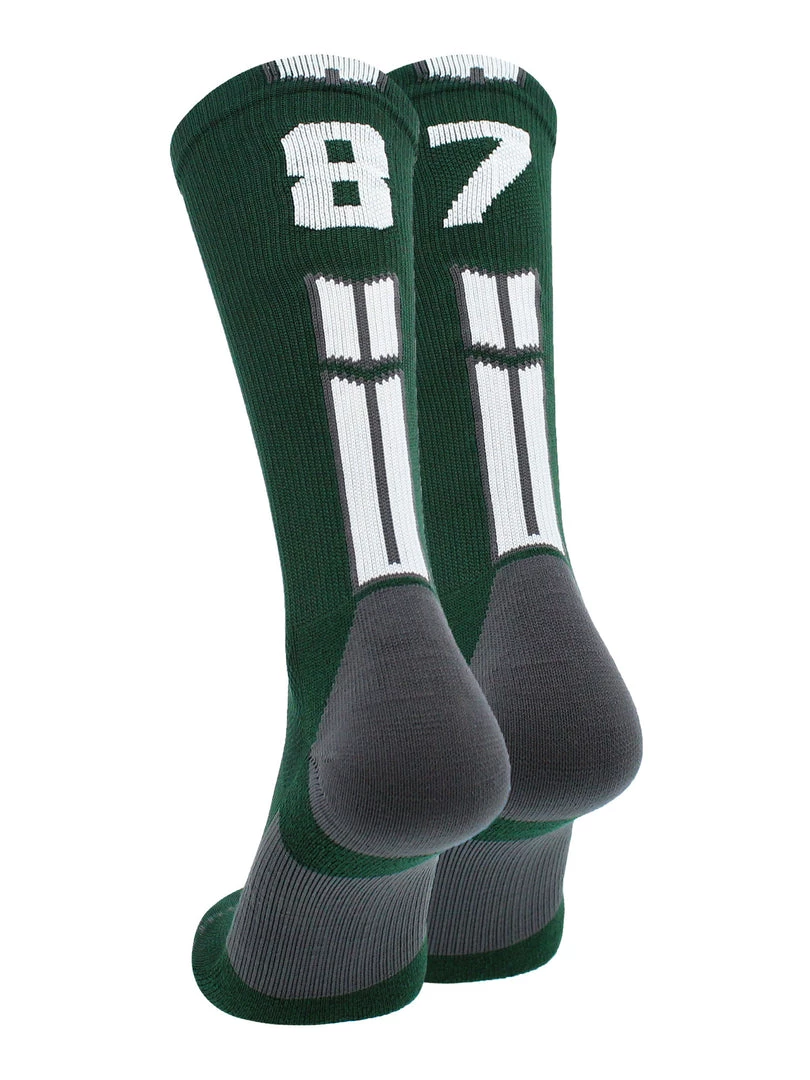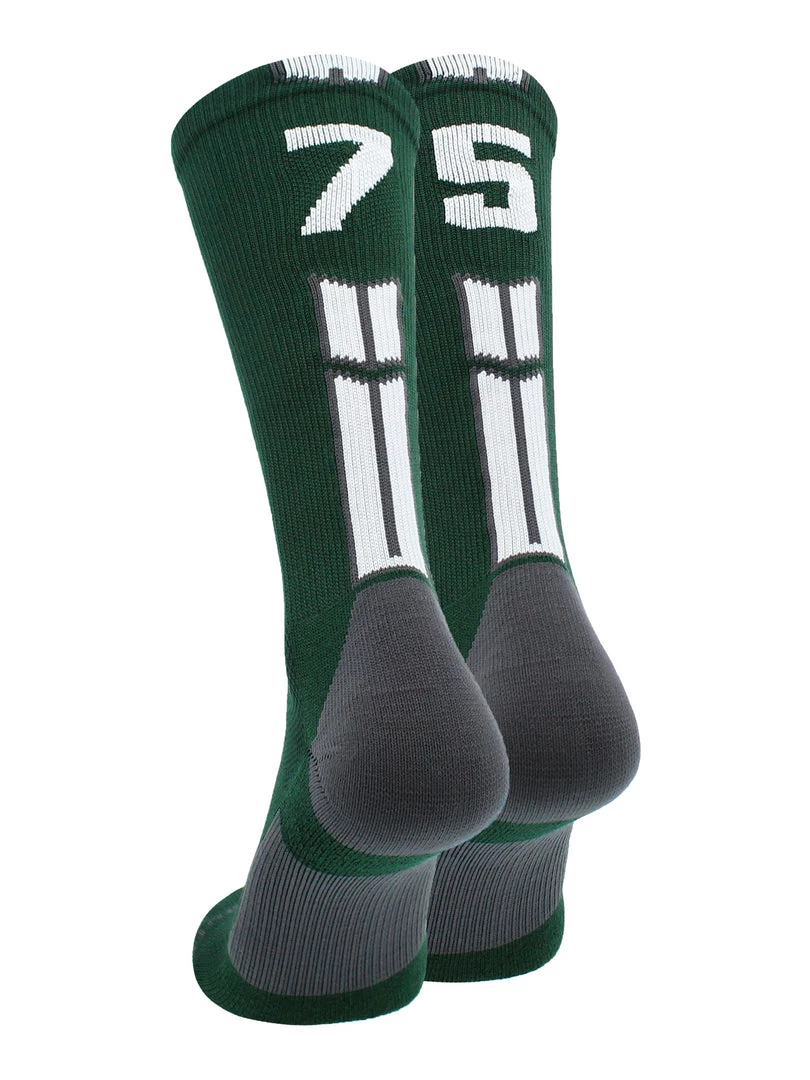 NUMBER SOCKS SOLD AS A PAIR!! MadSportsStuff Player Id Jersey Number Socks Crew Length Dark Green and White. Select your own personalized jersey number. High performance athletic number socks for all team sports and elite athletes. These jersey number socks are ideal for boys and girls and are great for basketball, football, volleyball, lacrosse and more!
