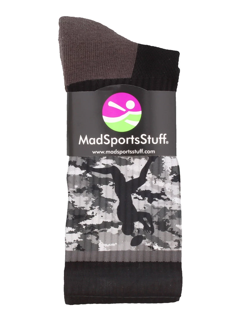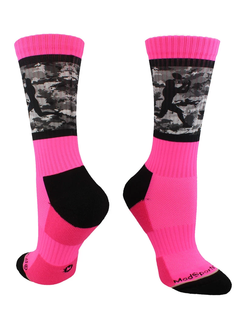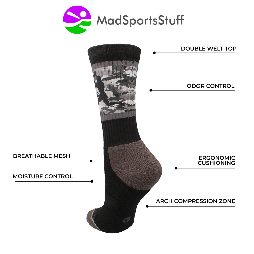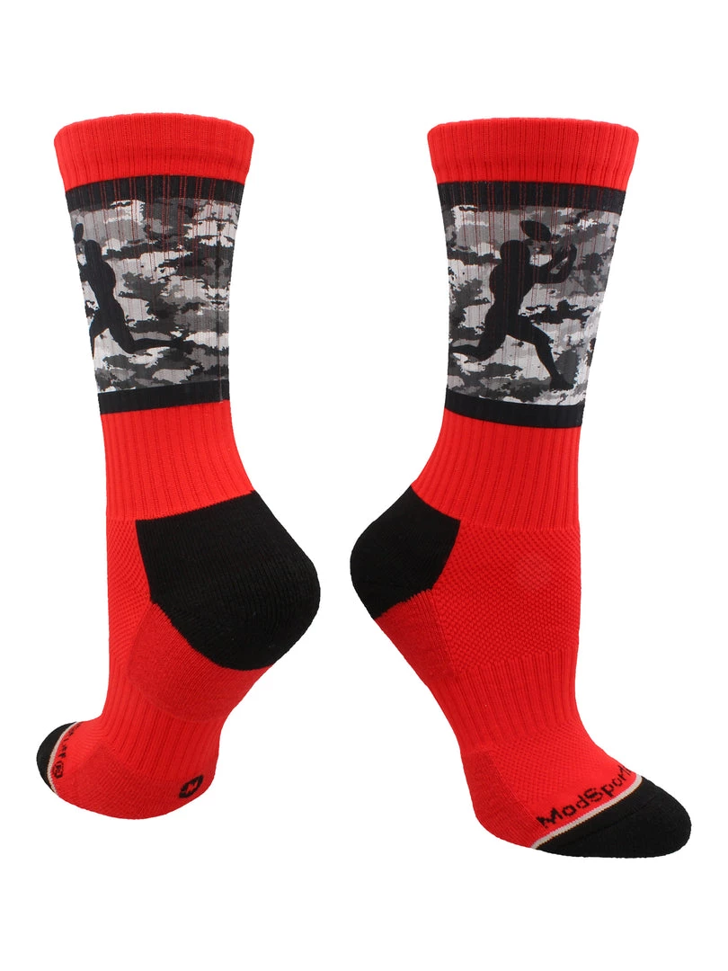 - PERFECT FOOTBALL SOCKS: This crew sock featuring a football player silhouette on a camo background is sure to be a hit with your favorite football or flag football enthusiast!
