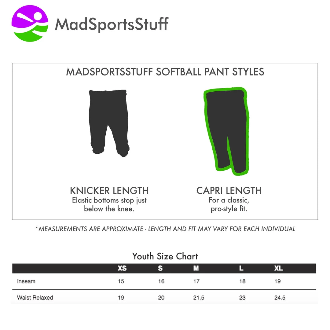 - PERFECT GIRLS SOFTBALL PANTS: These youth softball pants are great for practice or games. These capri length pants feature an elastic waistband and draw cord for adjustable fit.
