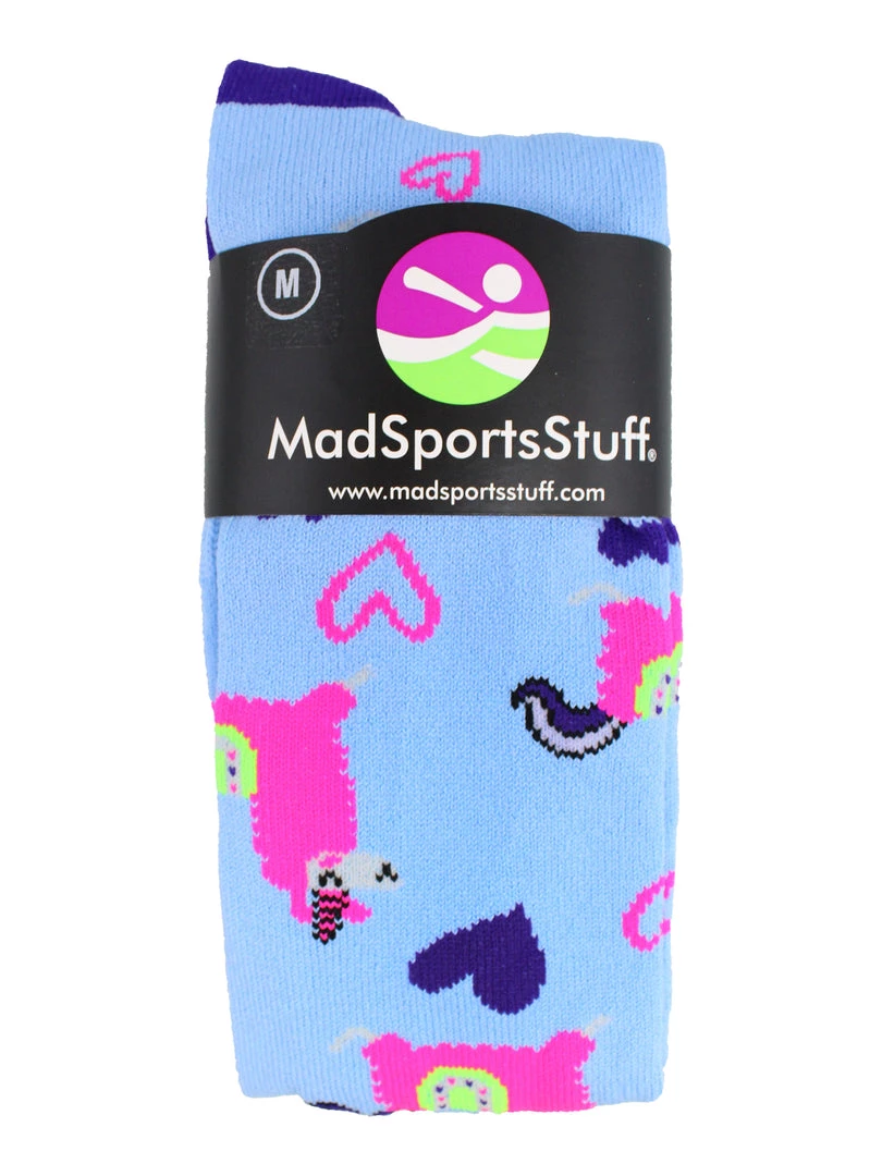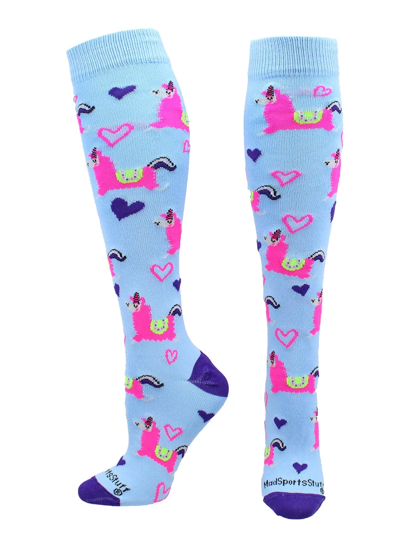 MadSportsStuff Half Llama Half Unicorn Llamacorn Socks in an over the calf length. High performance athletic socks for all team sports and elite athletes. These Llamacorn Socks are ideal for softball, soccer, volleyball, basketball, field hockey, cheer and more! Makes a great team sock!