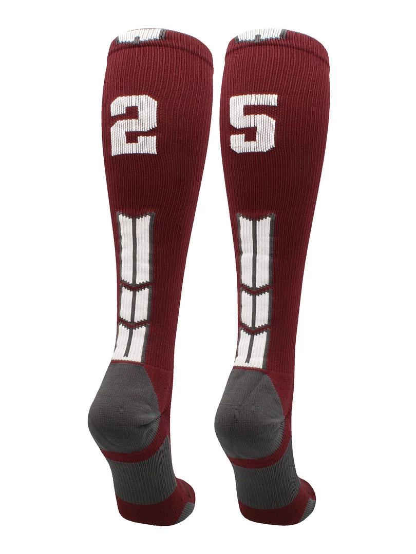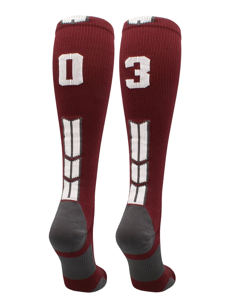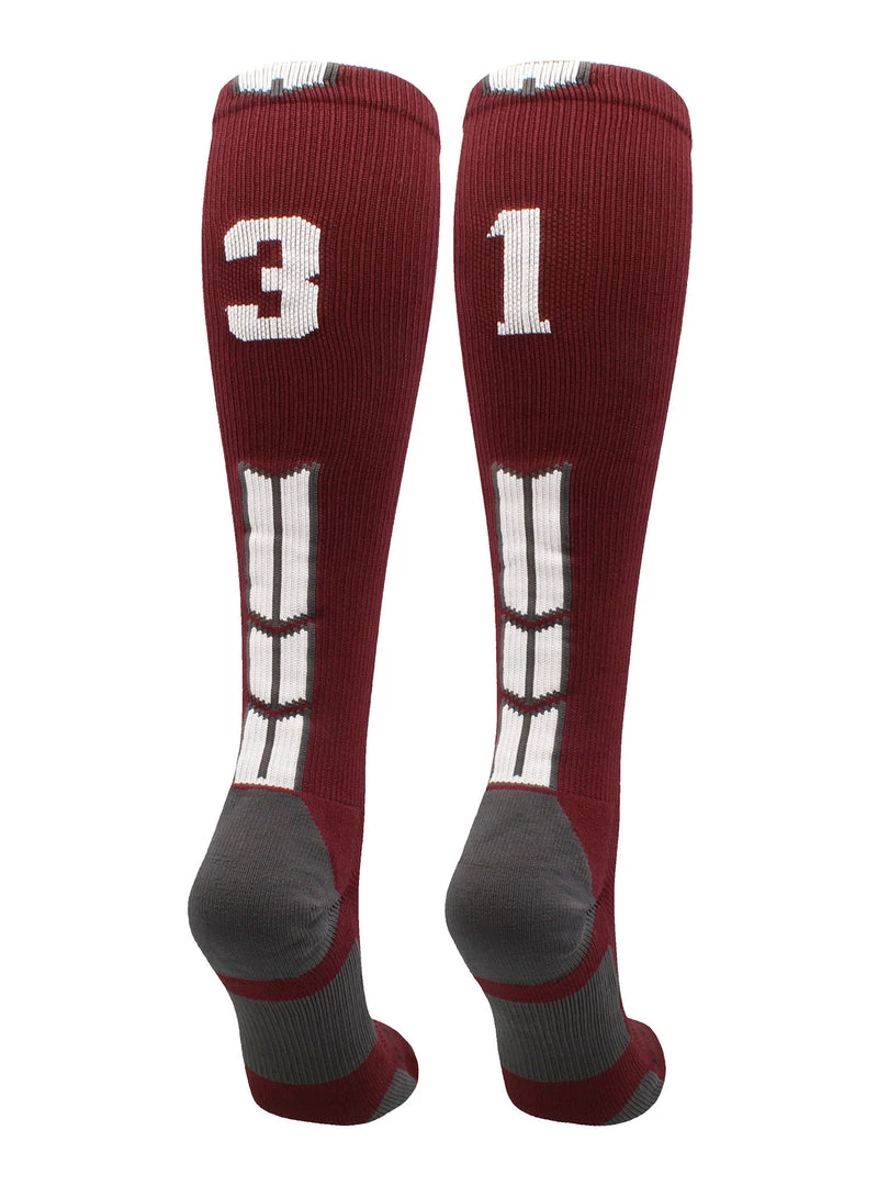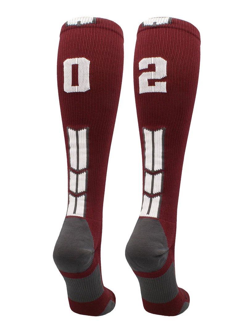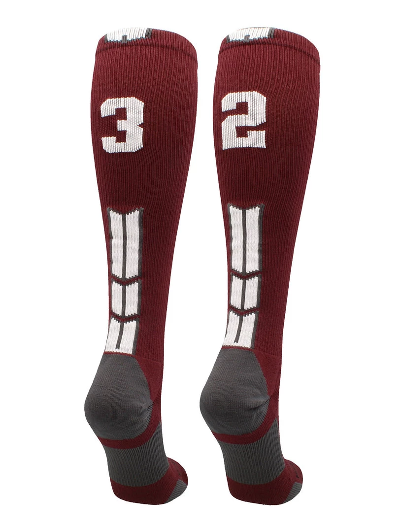 NUMBER SOCKS SOLD AS A PAIR!! MadSportsStuff Player Id Jersey Number Socks Over the Calf Length Maroon and White. Select your own personalized jersey number. High performance athletic number socks for all team sports and elite athletes. These jersey number socks are ideal for boys and girls and are great for soccer, football, baseball, softball, basketball, volleyball, lacrosse and more!