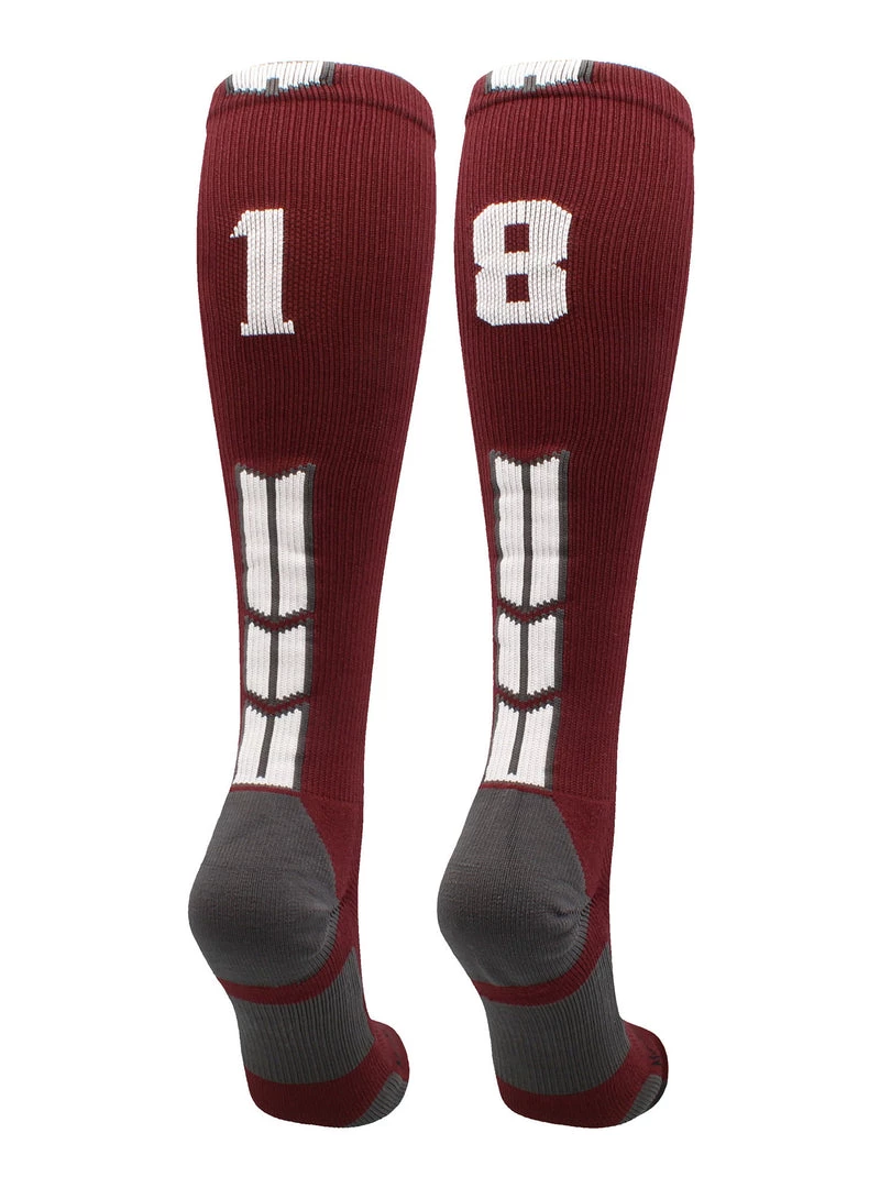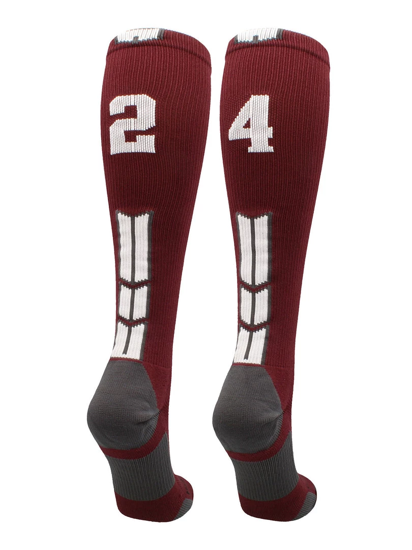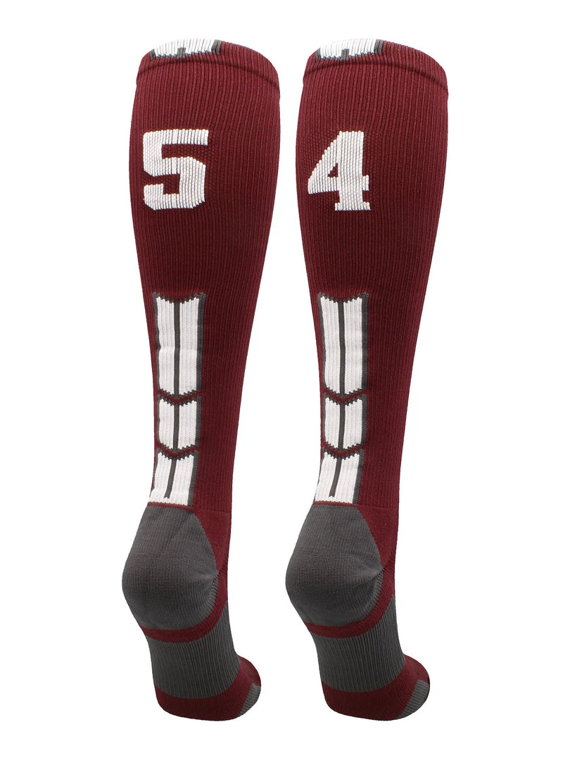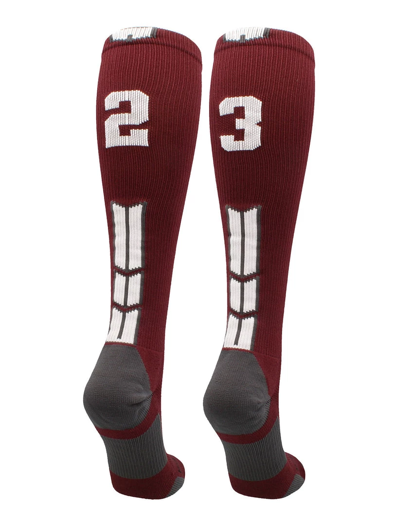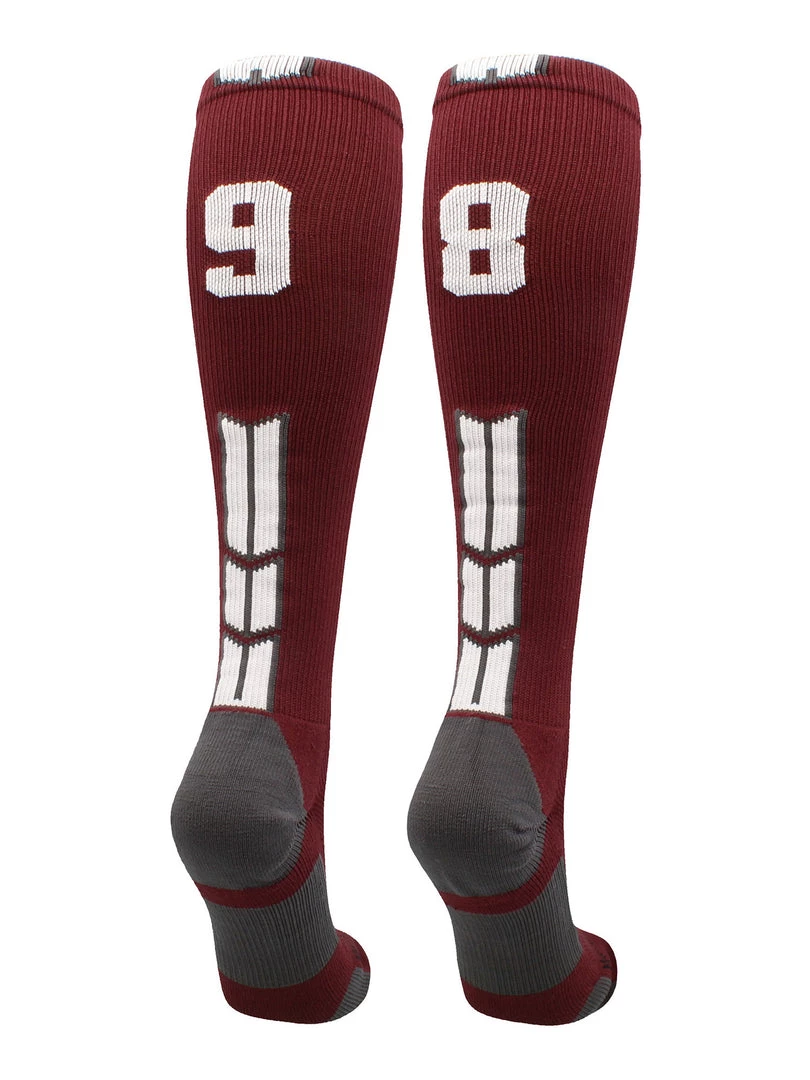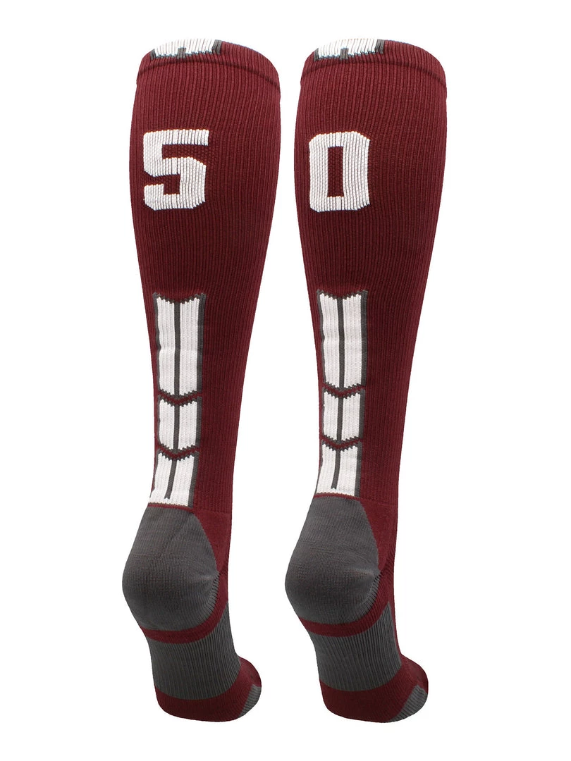 NUMBER SOCKS SOLD AS A PAIR!! MadSportsStuff Player Id Jersey Number Socks Over the Calf Length Maroon and White. Select your own personalized jersey number. High performance athletic number socks for all team sports and elite athletes. These jersey number socks are ideal for boys and girls and are great for soccer, football, baseball, softball, basketball, volleyball, lacrosse and more!