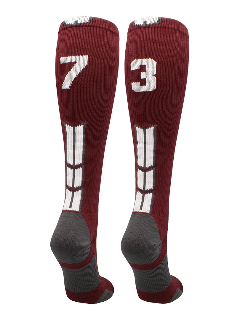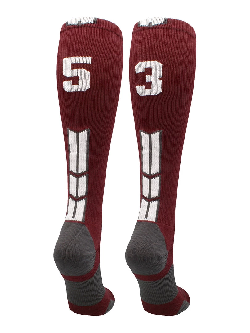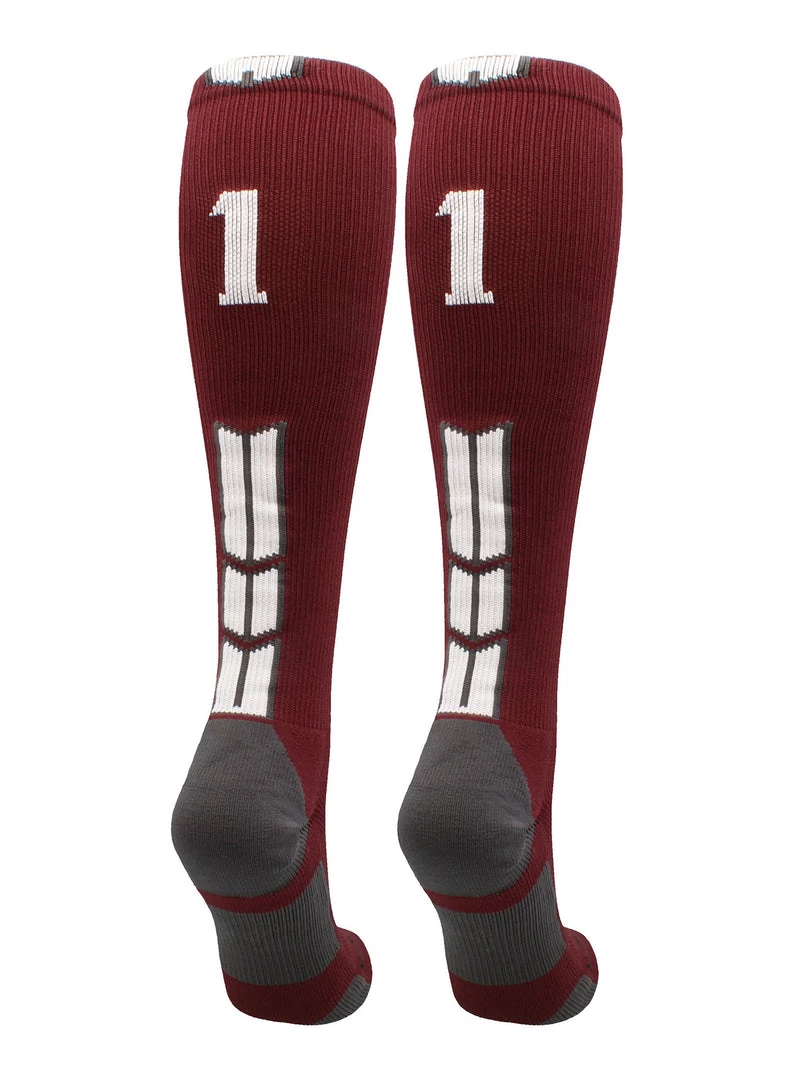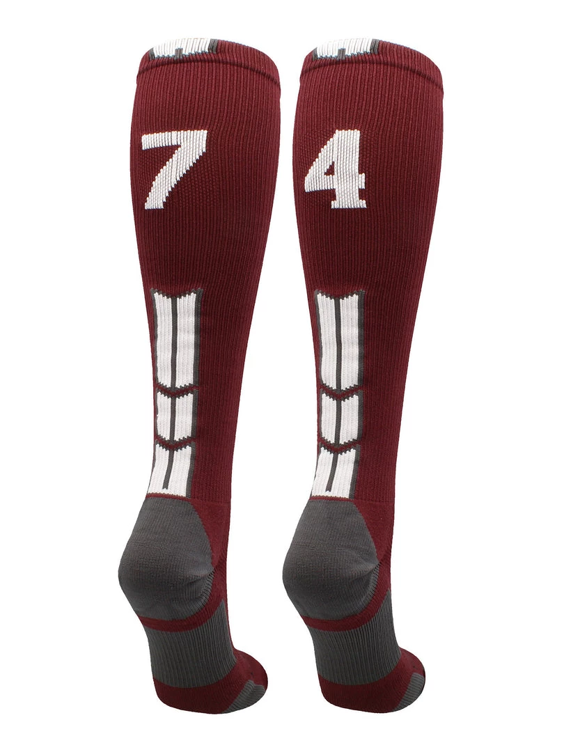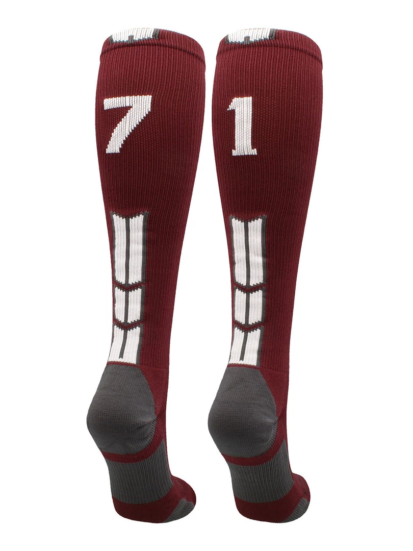 NUMBER SOCKS SOLD AS A PAIR!! MadSportsStuff Player Id Jersey Number Socks Over the Calf Length Maroon and White. Select your own personalized jersey number. High performance athletic number socks for all team sports and elite athletes. These jersey number socks are ideal for boys and girls and are great for soccer, football, baseball, softball, basketball, volleyball, lacrosse and more!