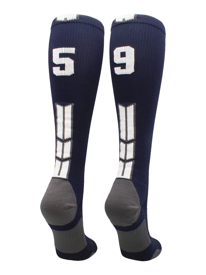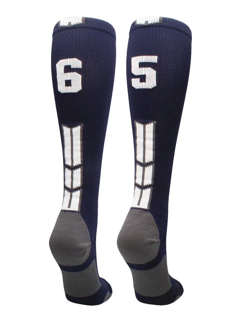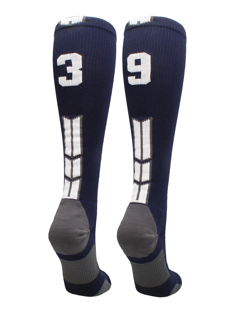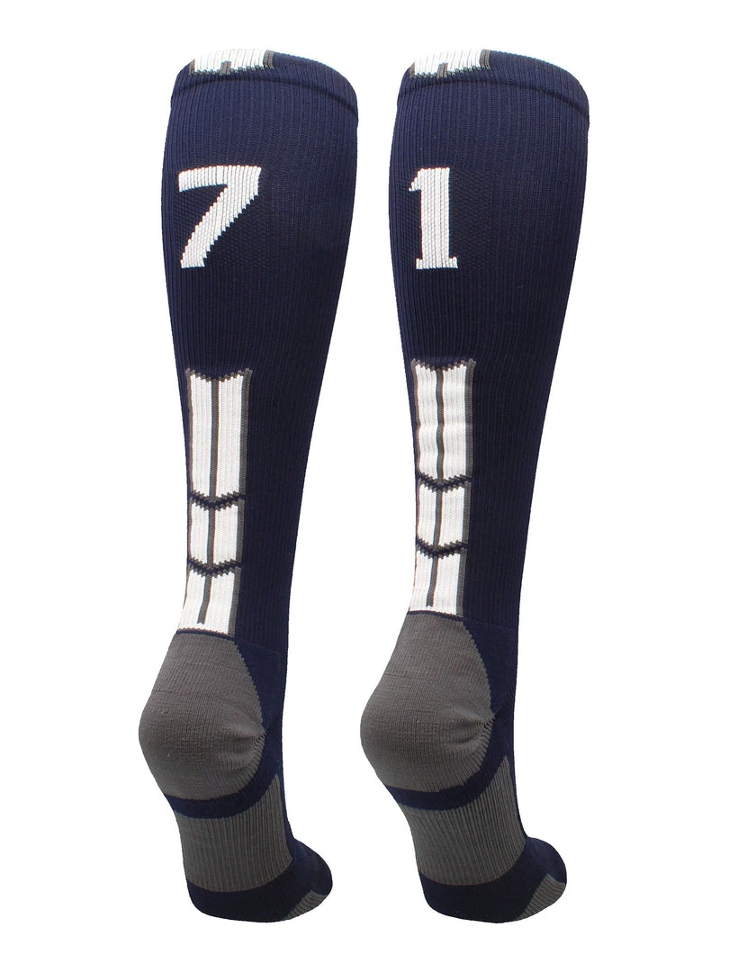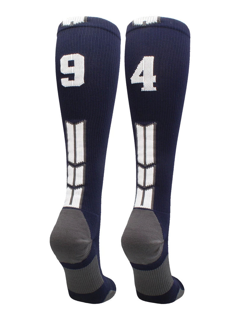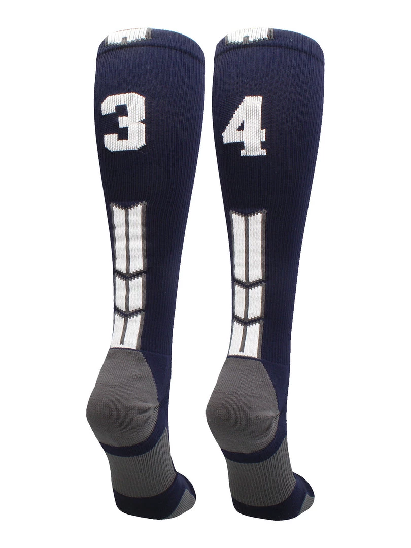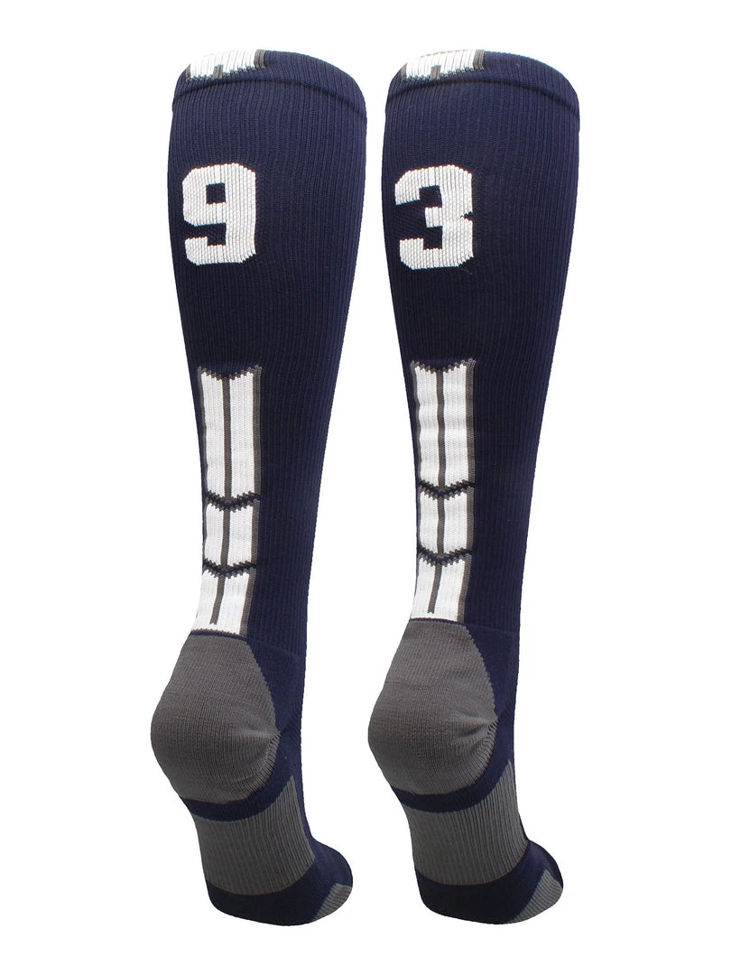NUMBER SOCKS SOLD AS A PAIR!! MadSportsStuff Player Id Jersey Number Socks Over the Calf Length Navy and White. Select your own personalized jersey number. High performance athletic number socks for all team sports and elite athletes. These jersey number socks are ideal for boys and girls and are great for soccer, football, baseball, softball, basketball, volleyball, lacrosse and more!