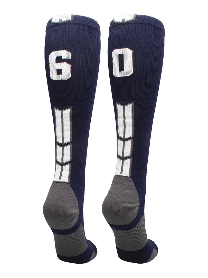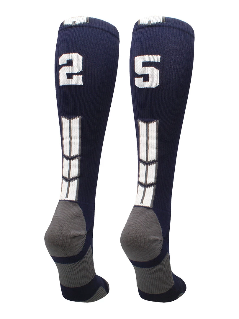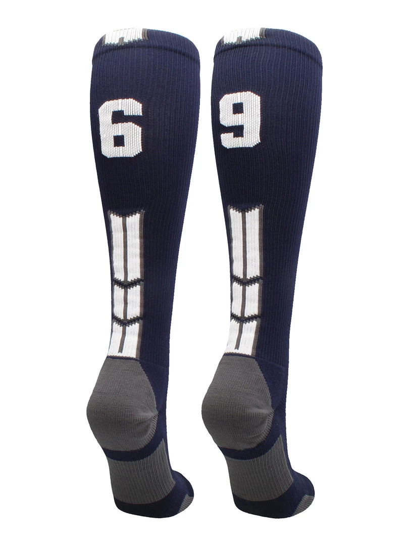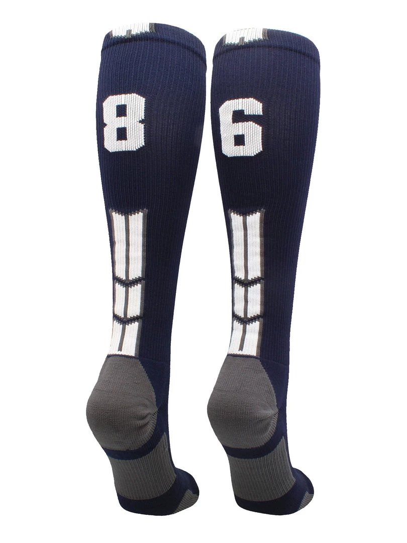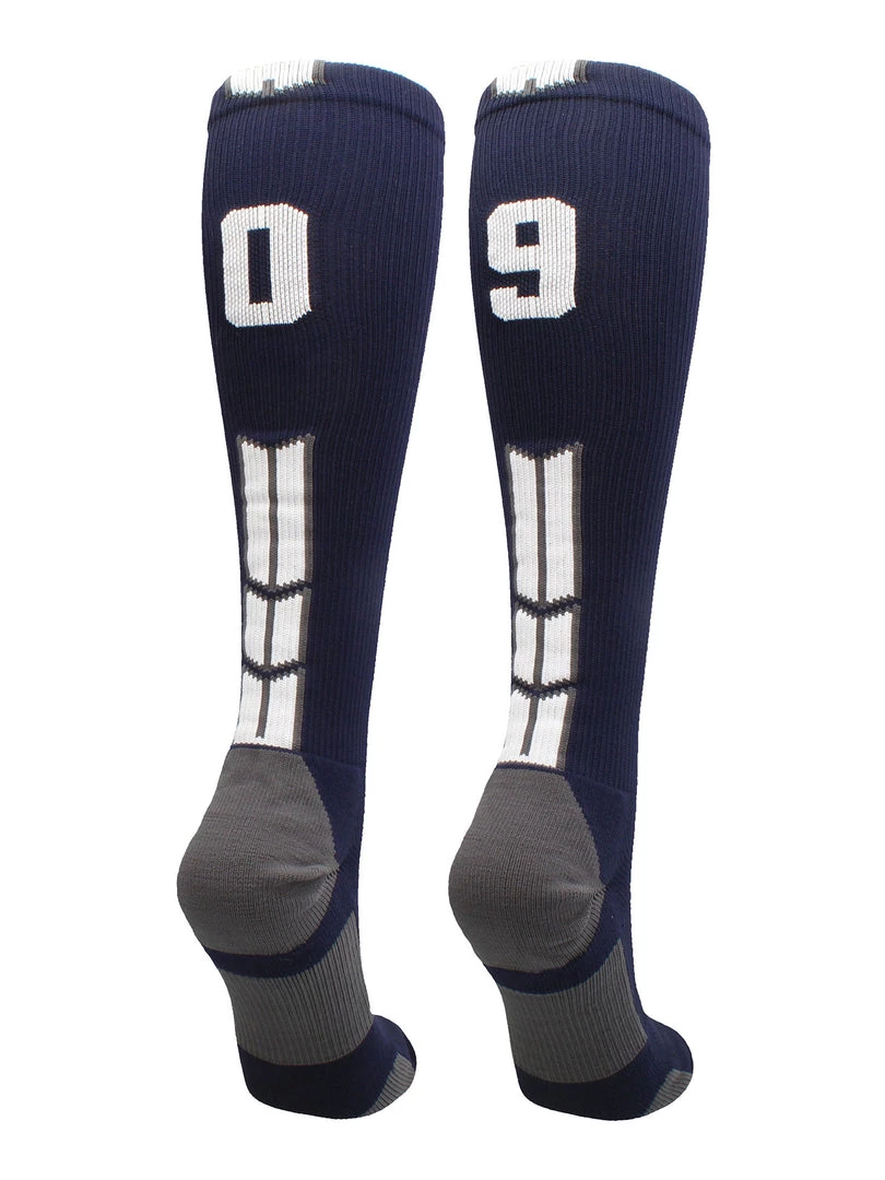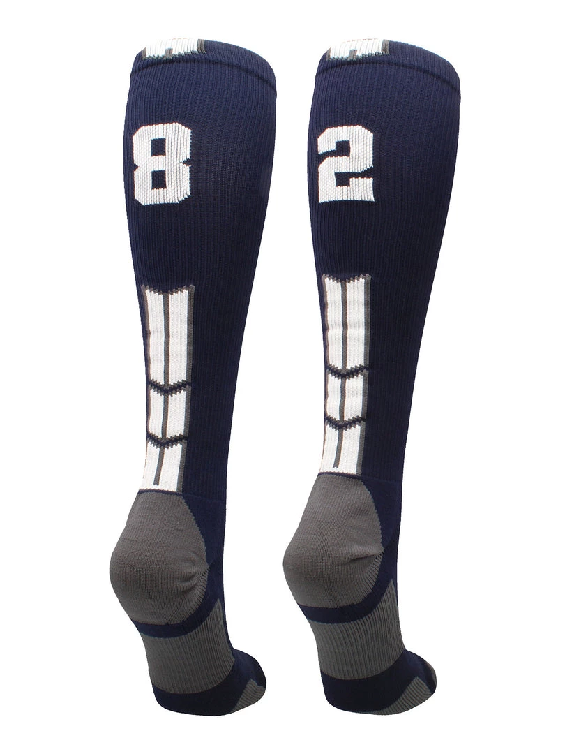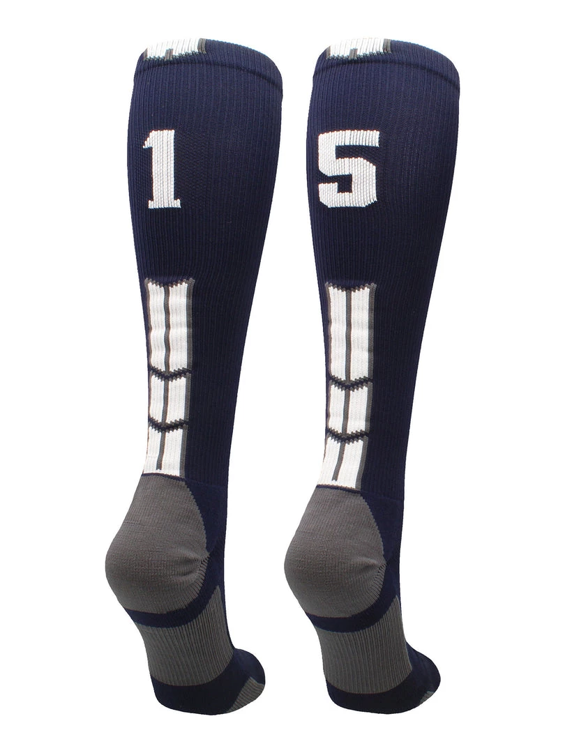 NUMBER SOCKS SOLD AS A PAIR!! MadSportsStuff Player Id Jersey Number Socks Over the Calf Length Navy and White. Select your own personalized jersey number. High performance athletic number socks for all team sports and elite athletes. These jersey number socks are ideal for boys and girls and are great for soccer, football, baseball, softball, basketball, volleyball, lacrosse and more!