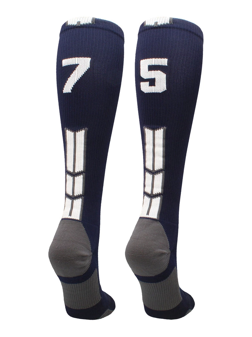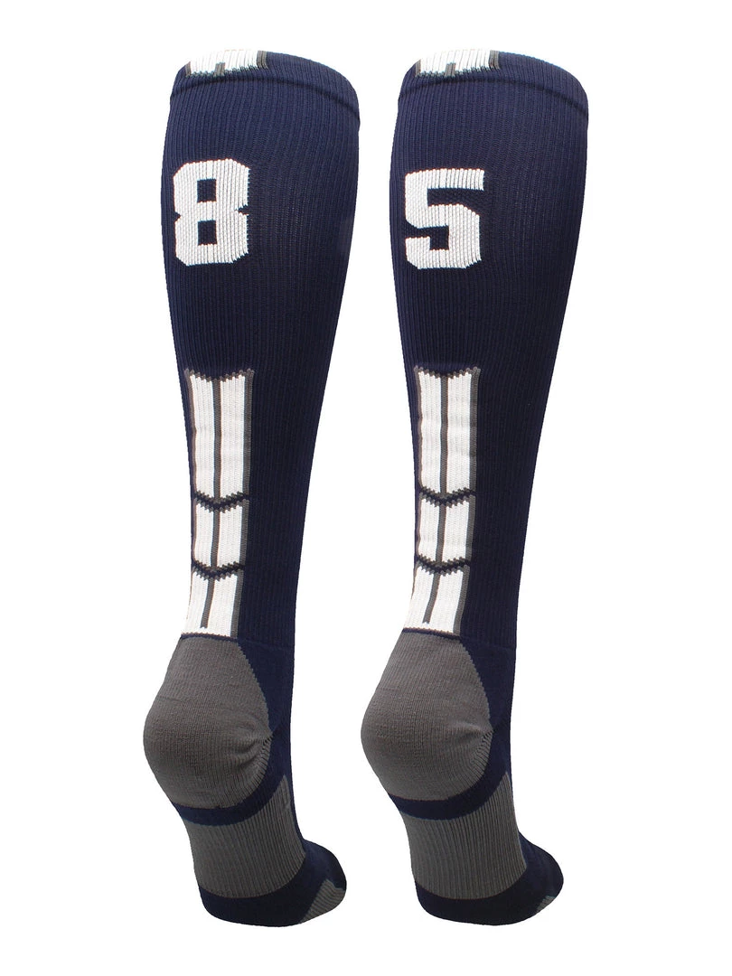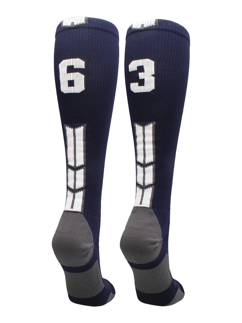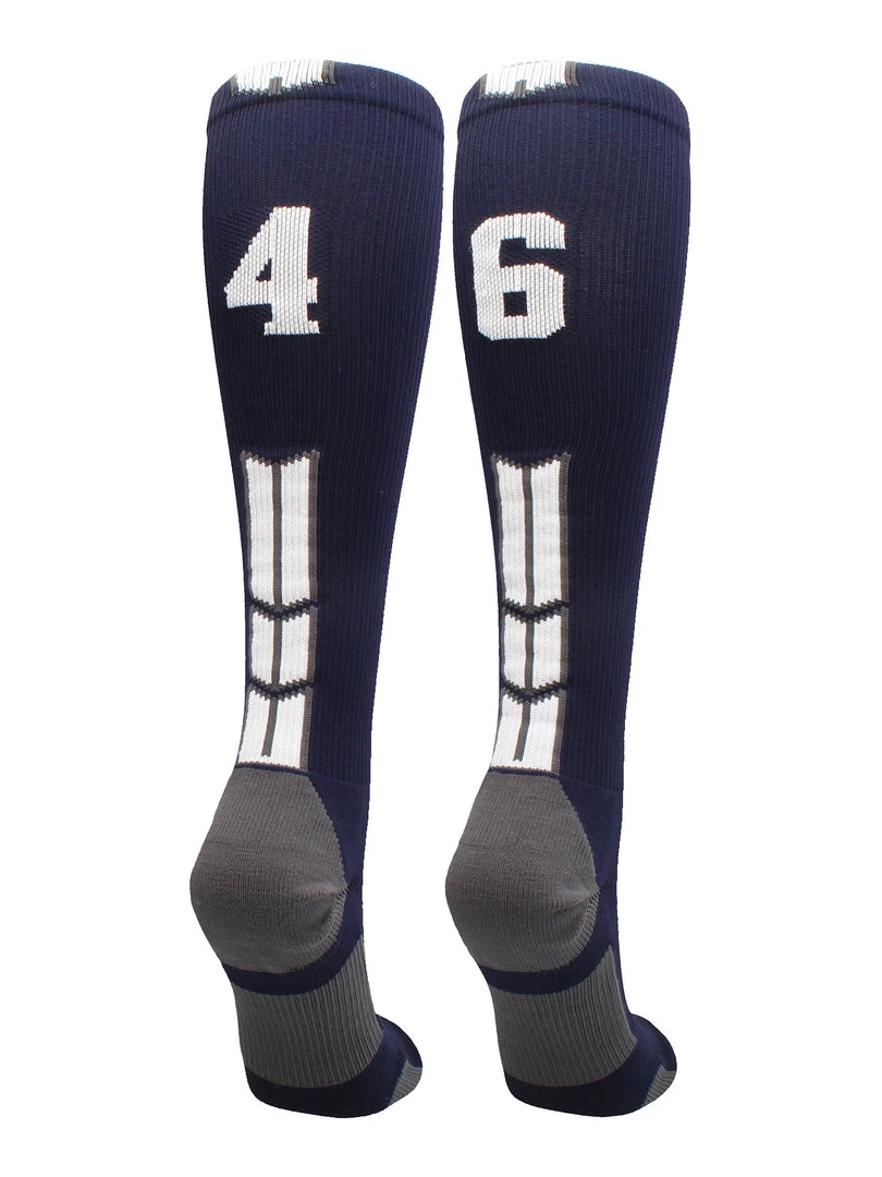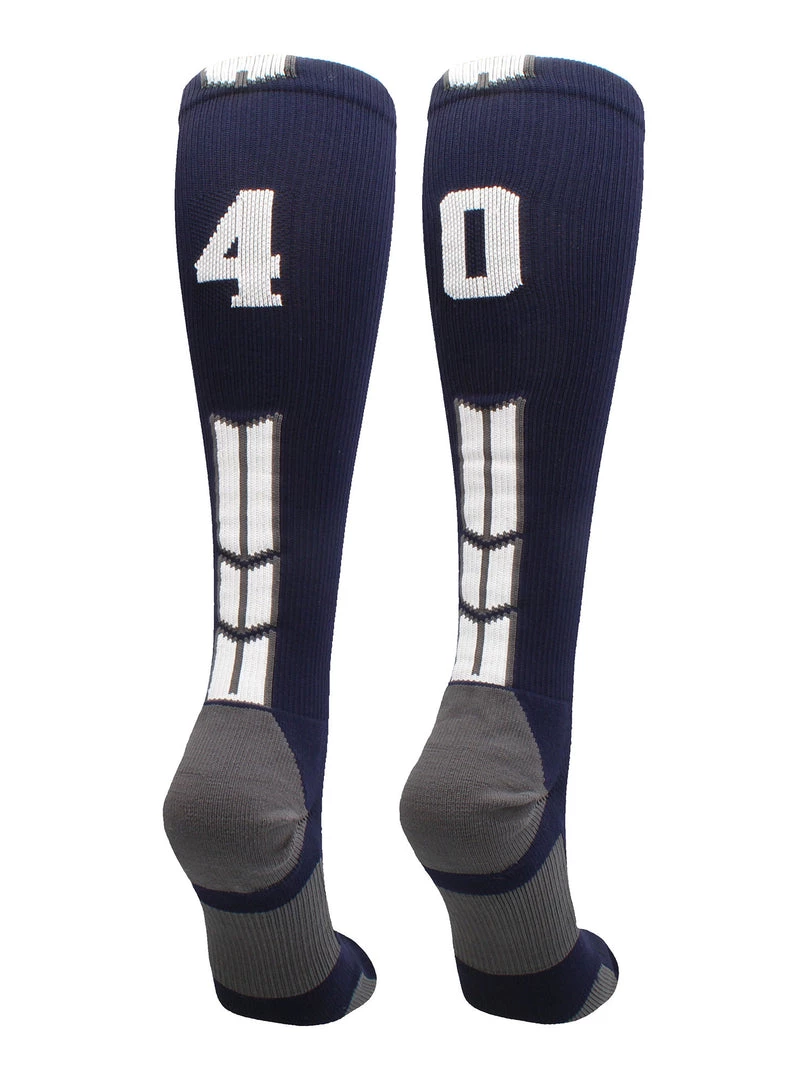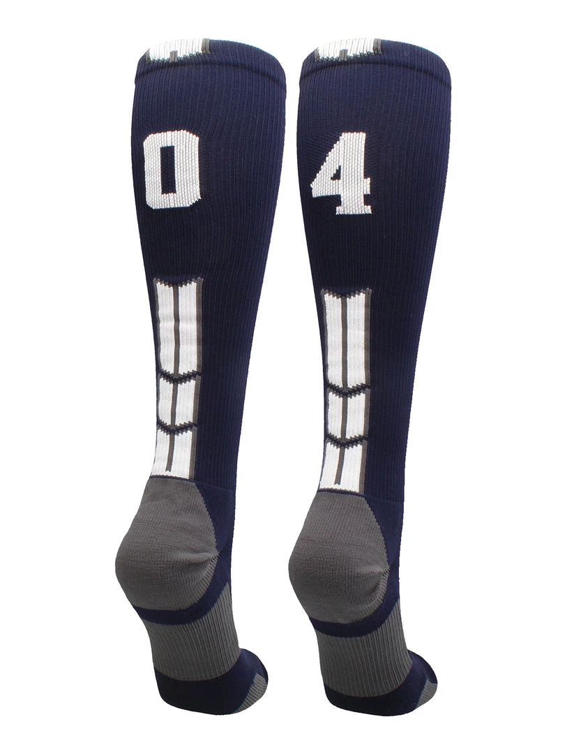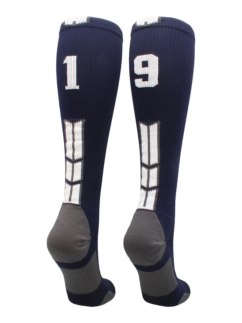 NUMBER SOCKS SOLD AS A PAIR!! MadSportsStuff Player Id Jersey Number Socks Over the Calf Length Navy and White. Select your own personalized jersey number. High performance athletic number socks for all team sports and elite athletes. These jersey number socks are ideal for boys and girls and are great for soccer, football, baseball, softball, basketball, volleyball, lacrosse and more!