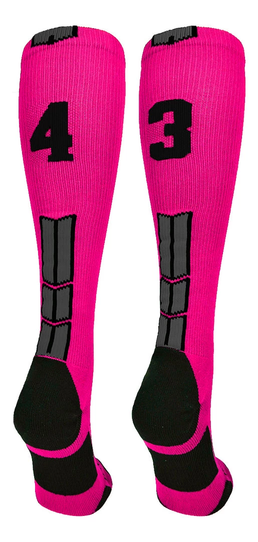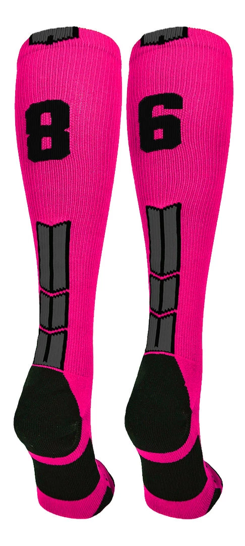 NUMBER SOCKS SOLD AS A PAIR!! MadSportsStuff Player Id Jersey Number Socks Over the Calf Length Neon Pink and Black. Select your own personalized jersey number. High performance athletic number socks for all team sports and elite athletes. These jersey number socks are ideal for boys and girls and are great for soccer, football, baseball, softball, basketball, volleyball, lacrosse and more!