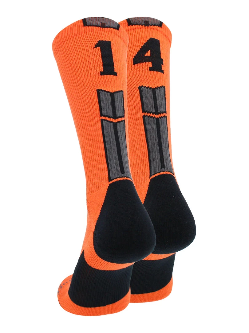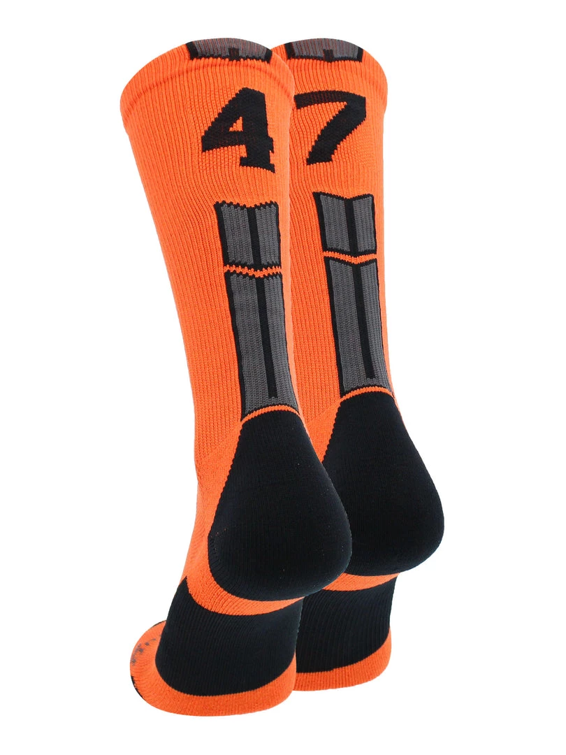 NUMBER SOCKS SOLD AS A PAIR!! MadSportsStuff Player Id Jersey Number Socks Crew Length Orange and Black. Select your own personalized jersey number. High performance athletic number socks for all team sports and elite athletes. These jersey number socks are ideal for boys and girls and are great for basketball, football, volleyball, lacrosse and more!