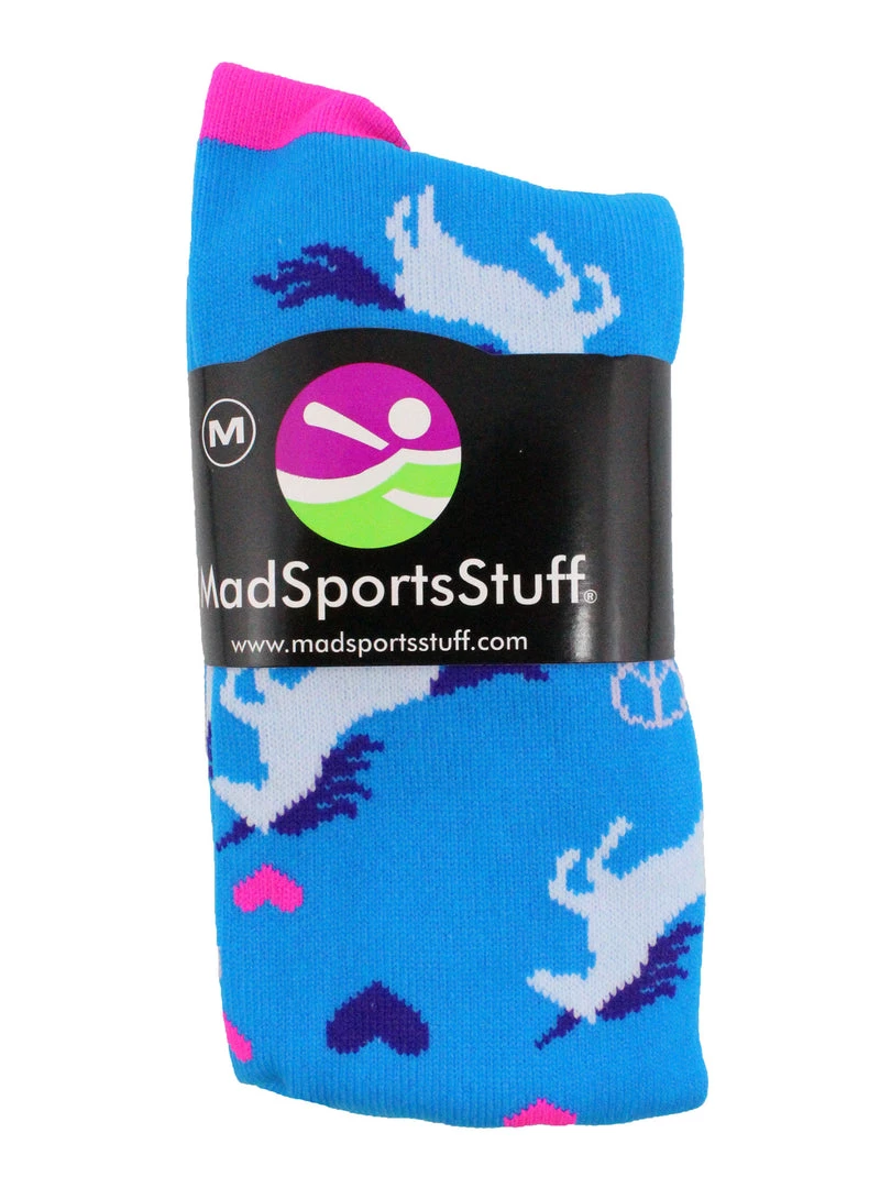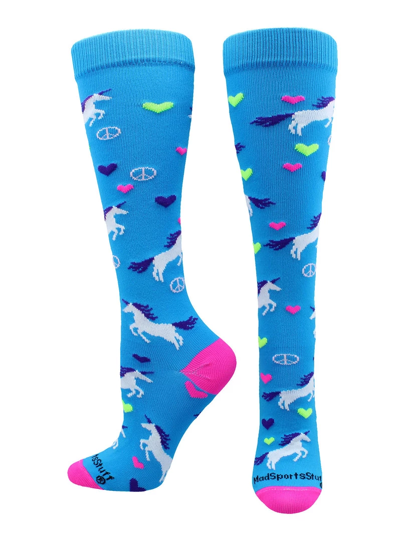 MadSportsStuff Peace Love Unicorn Athletic Over the Calf Socks. High performance athletic socks for all team sports and elite athletes. Ideal for softball, soccer, field hockey, lacrosse, basketball and more!