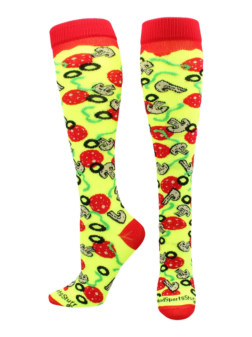 - PERFECT SPORTS SOCKS: Show your inner cheese lover while wearing these pizza socks featuring olives, mushrooms, green pepper and pepperoni. Great for softball, basketball, field hockey, soccer, volleyball, lacrosse, t-ball and more!!