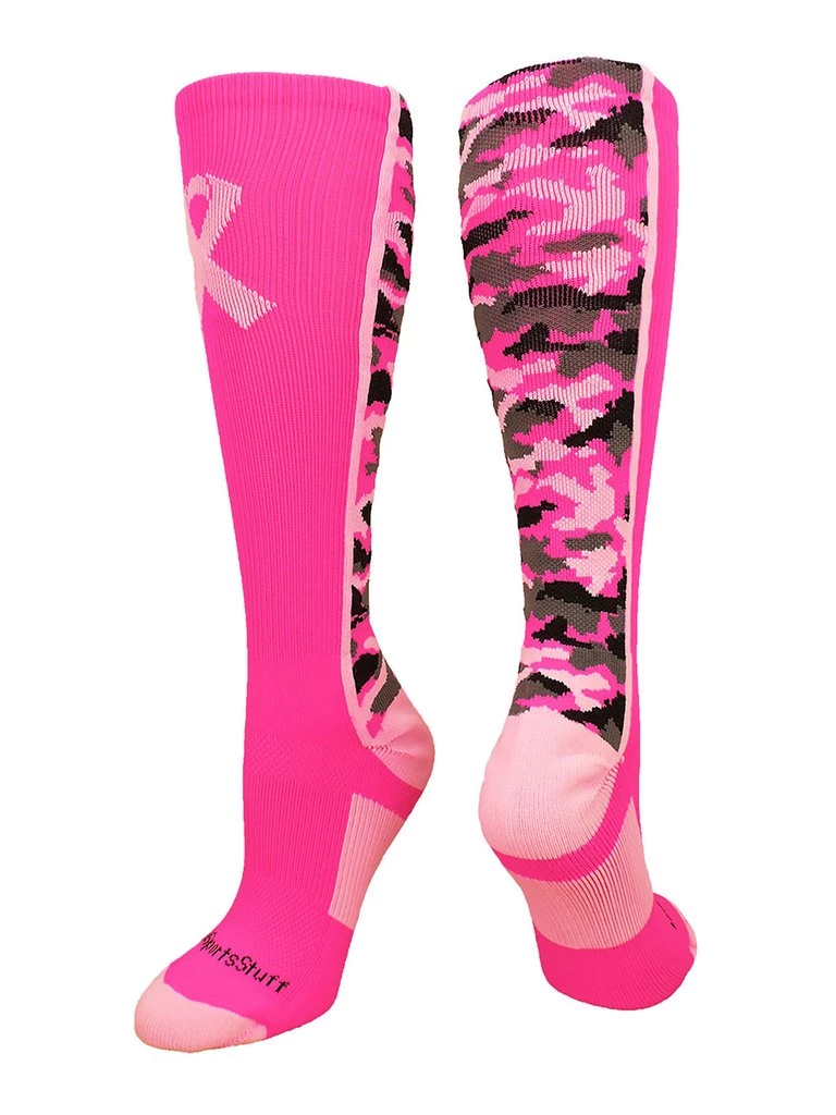 Pink Ribbon Breast Cancer Awareness Camo Over the Calf Socks. High performance athletic socks for all team sports and elite athletes.