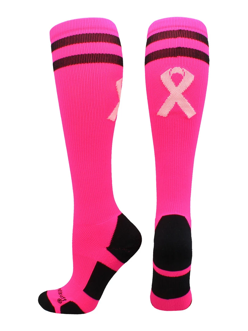 MadSportsStuff Pink Ribbon Breast Cancer Awareness Socks with Stripes. High performance athletic socks for all team sports and elite athletes. This sock is an over the calf length which hits just below the knee. Ideal for football, baseball, softball, soccer, field hockey, basketball, lacrosse, volleyball, wrestling and more!