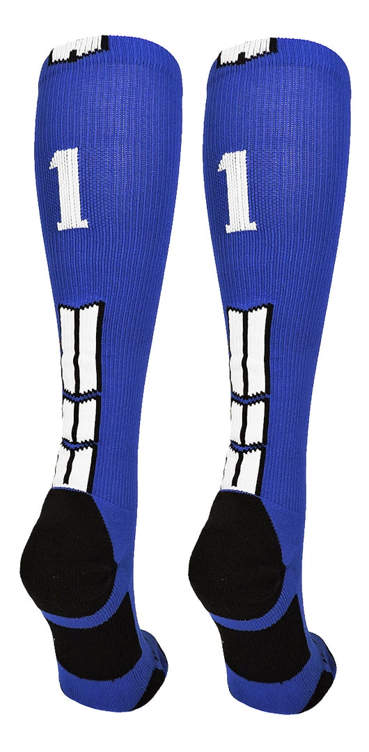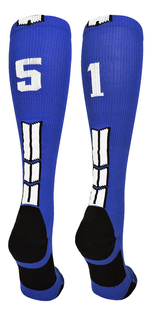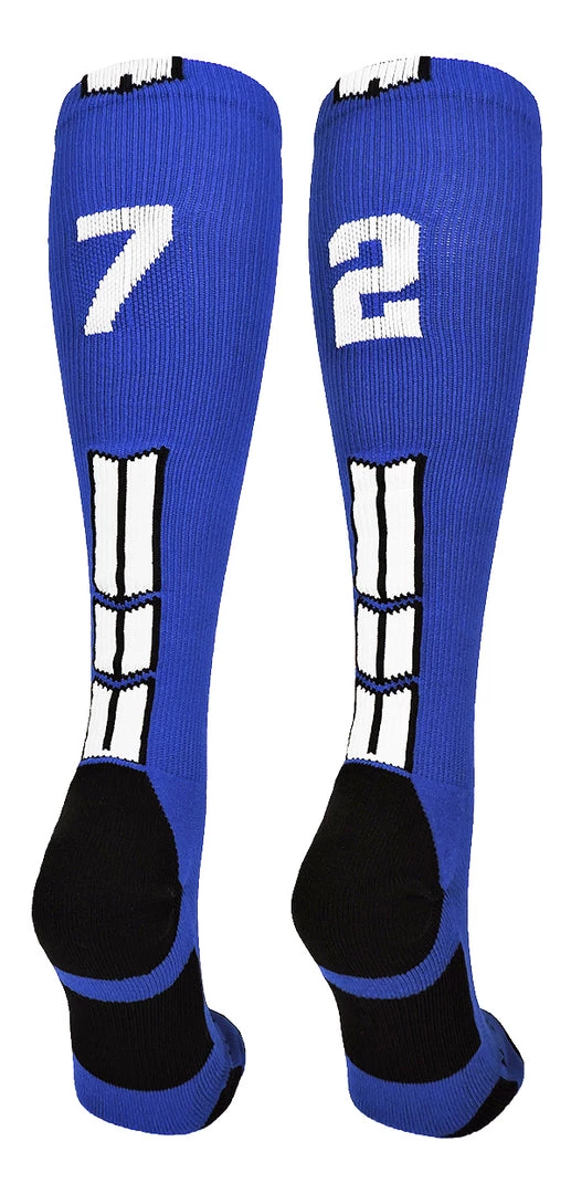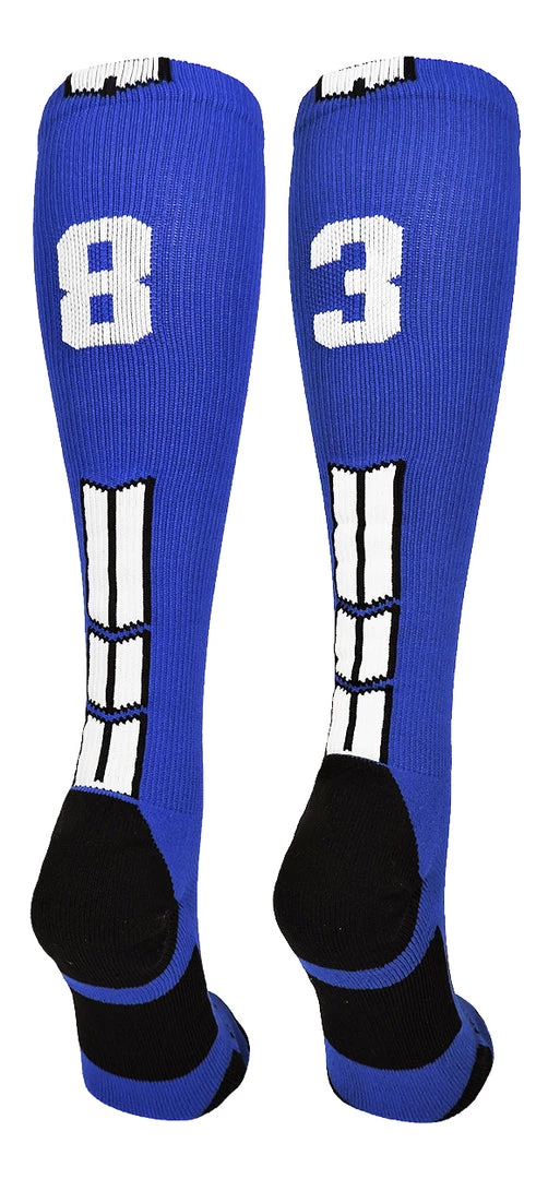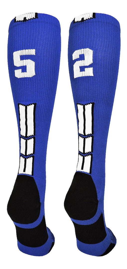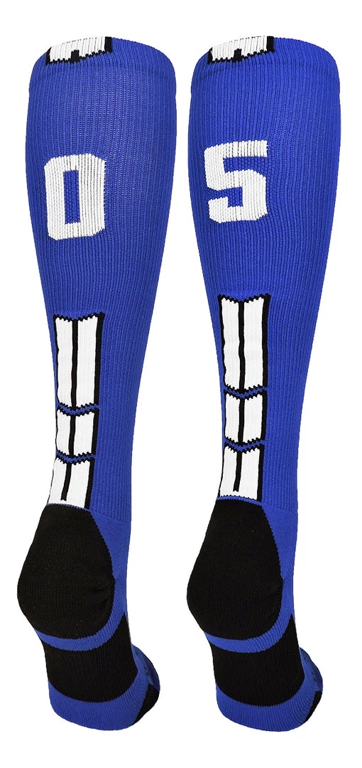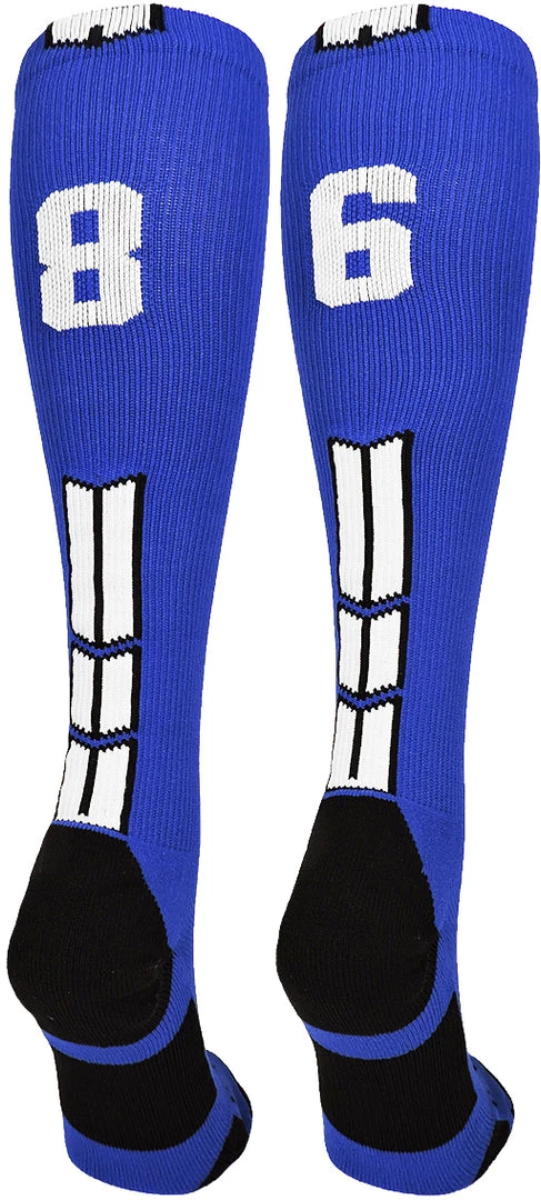 NUMBER SOCKS SOLD AS A PAIR!! MadSportsStuff Player Id Jersey Number Socks Over the Calf Length Royal and White. Select your own personalized jersey number. High performance athletic number socks for all team sports and elite athletes. These jersey number socks are ideal for boys and girls and are great for soccer, football, baseball, softball, basketball, volleyball, lacrosse and more!