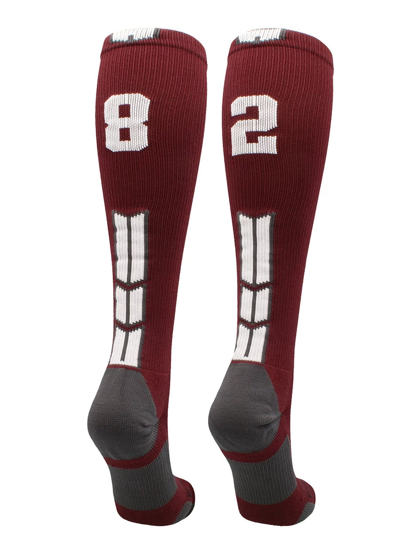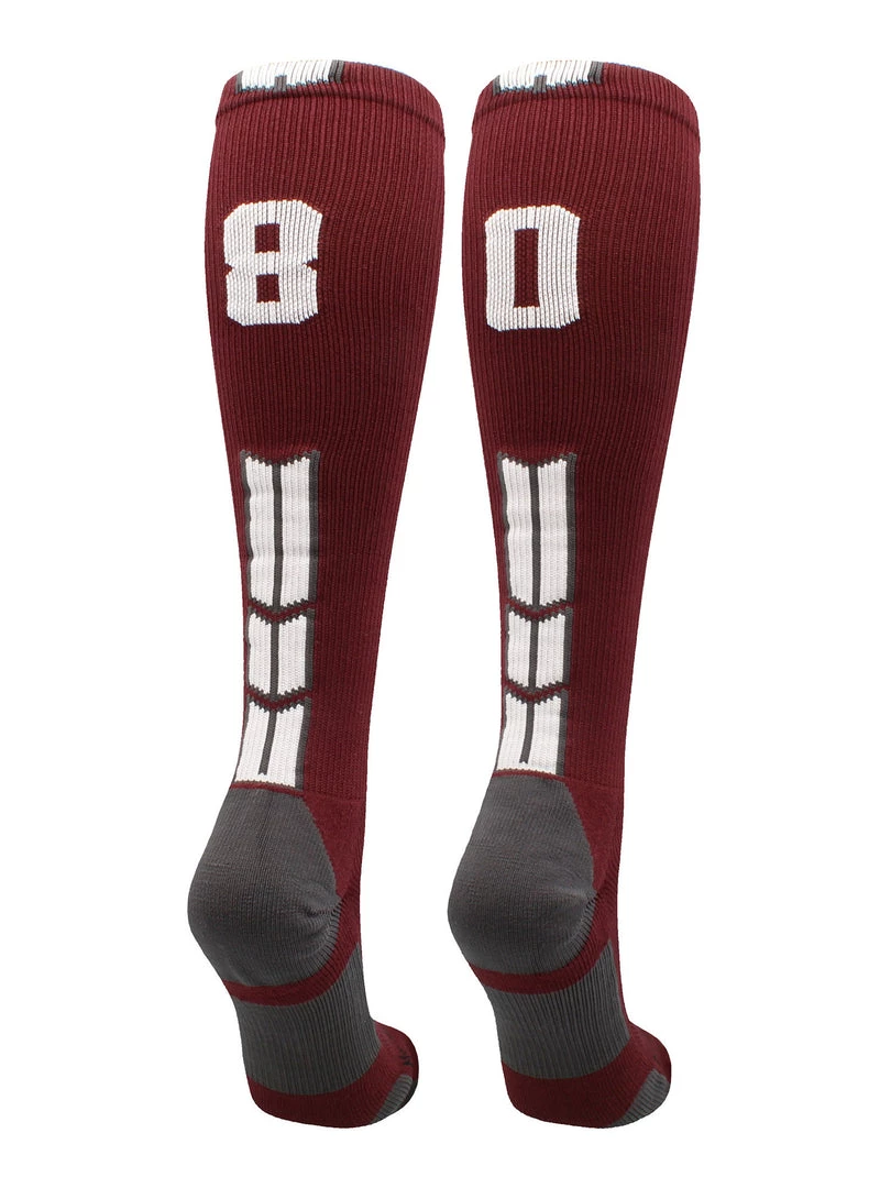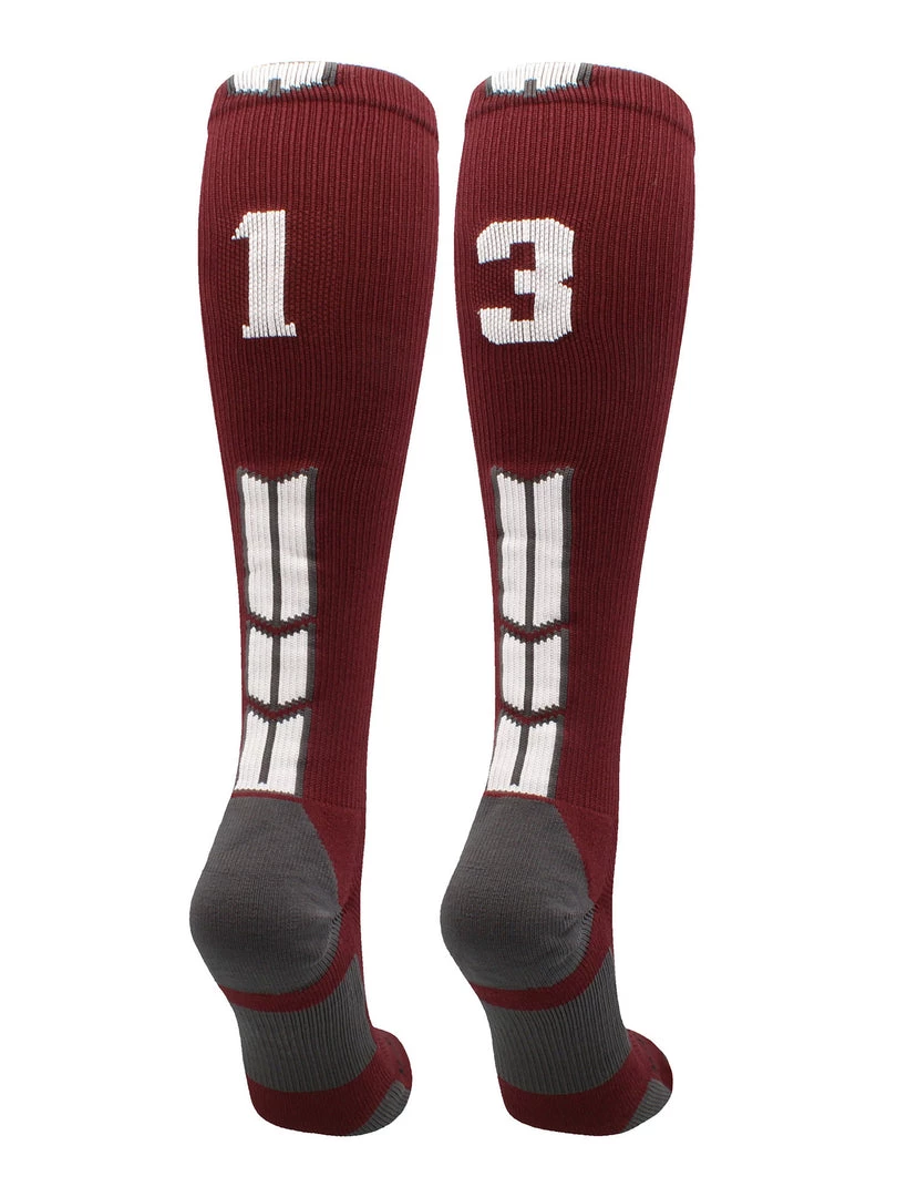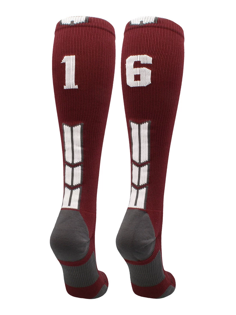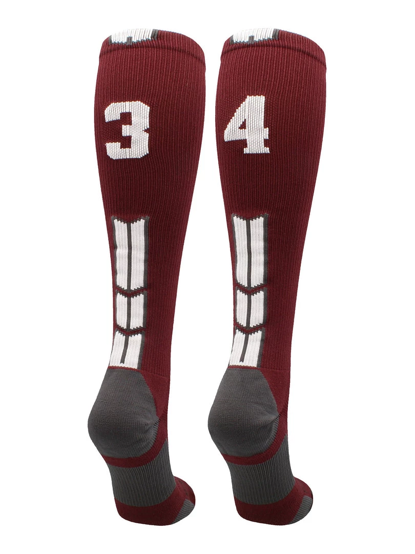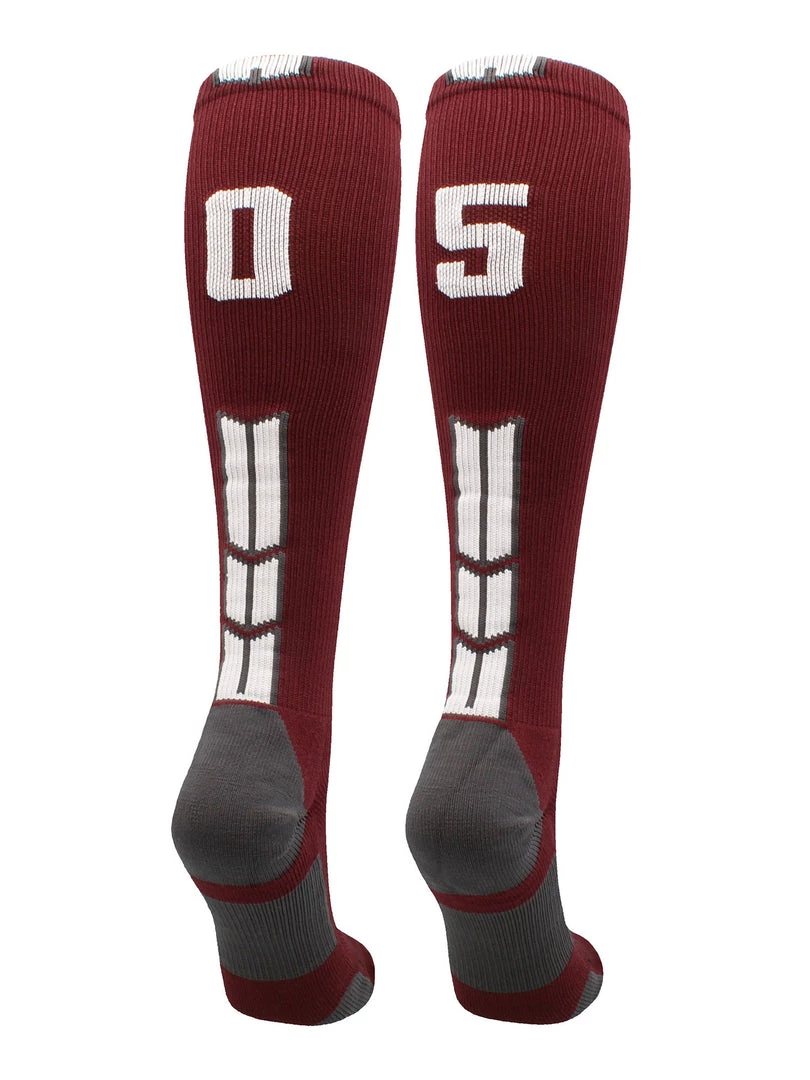 NUMBER SOCKS SOLD AS A PAIR!! MadSportsStuff Player Id Jersey Number Socks Over the Calf Length Maroon and White. Select your own personalized jersey number. High performance athletic number socks for all team sports and elite athletes. These jersey number socks are ideal for boys and girls and are great for soccer, football, baseball, softball, basketball, volleyball, lacrosse and more!