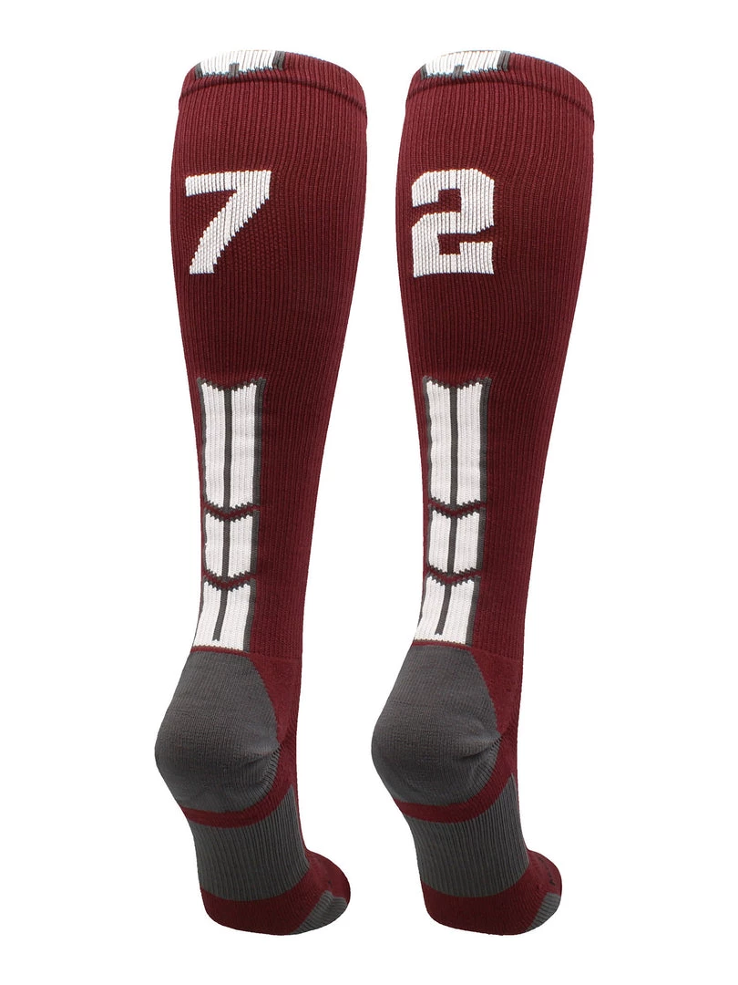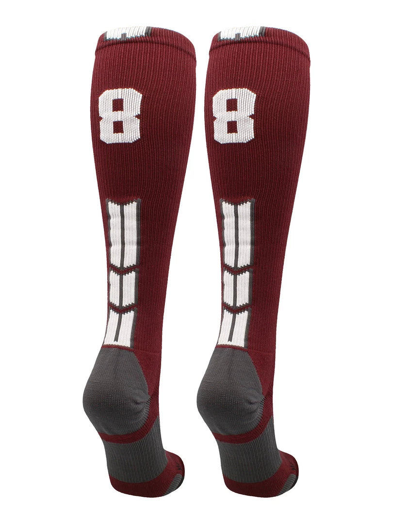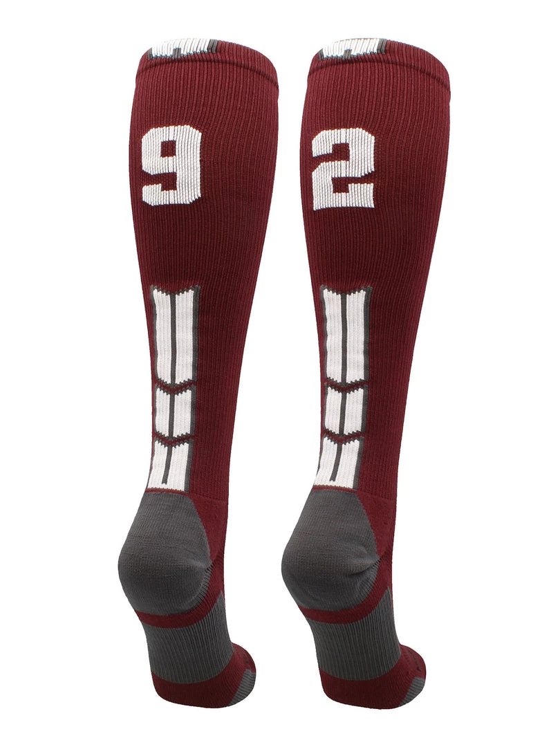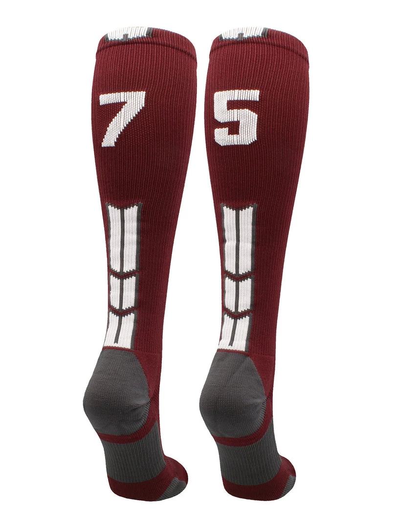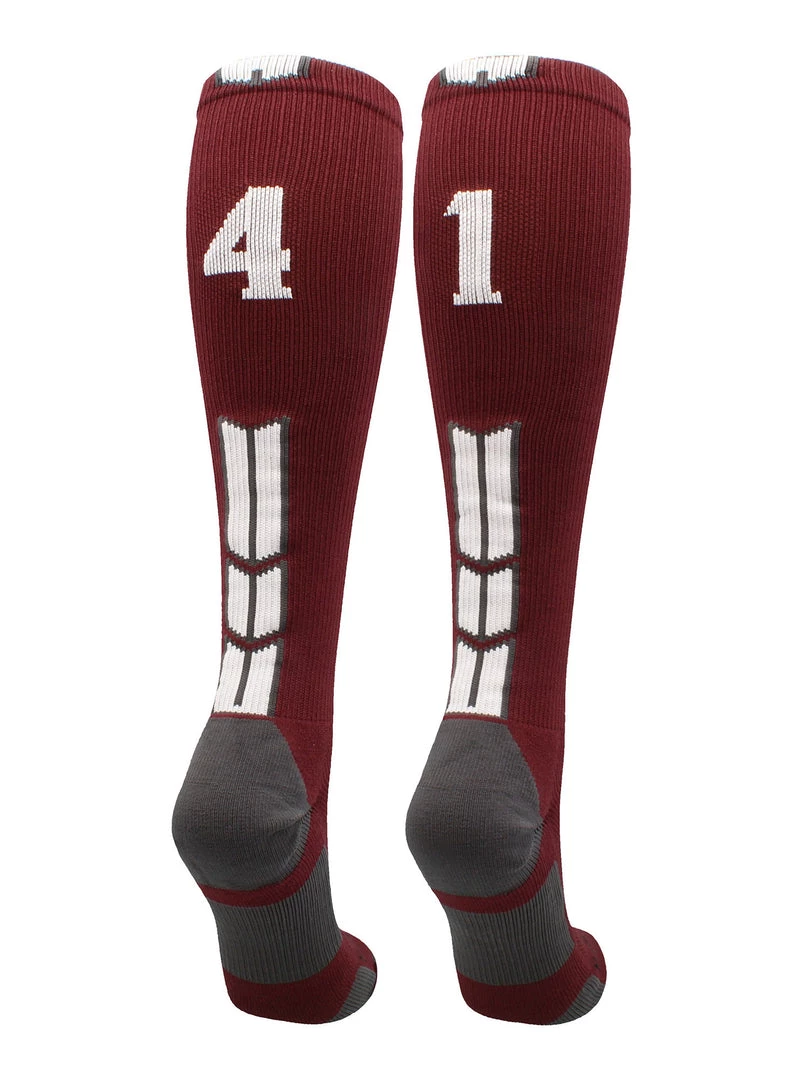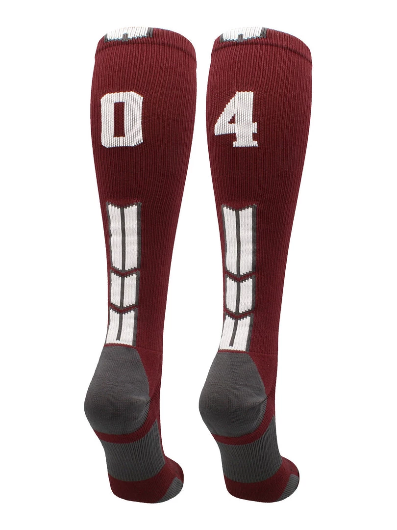 NUMBER SOCKS SOLD AS A PAIR!! MadSportsStuff Player Id Jersey Number Socks Over the Calf Length Maroon and White. Select your own personalized jersey number. High performance athletic number socks for all team sports and elite athletes. These jersey number socks are ideal for boys and girls and are great for soccer, football, baseball, softball, basketball, volleyball, lacrosse and more!