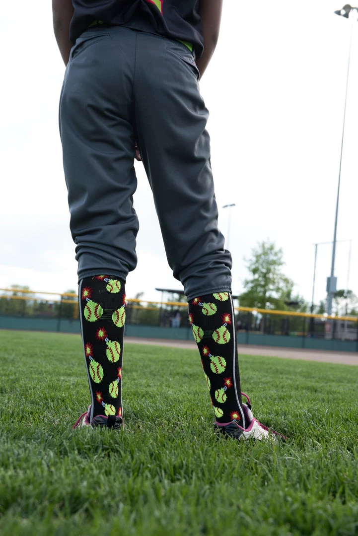 - PERFECT SPORTS SOCKS: These socks have softballs shaped as bombs, lit up, in an over the calf length. Great for teams such as Softball Bombers, Softball Bombs, Firecrackers, or for some super fun, crazy socks to light up the field. Also see our softball bomber headbands.