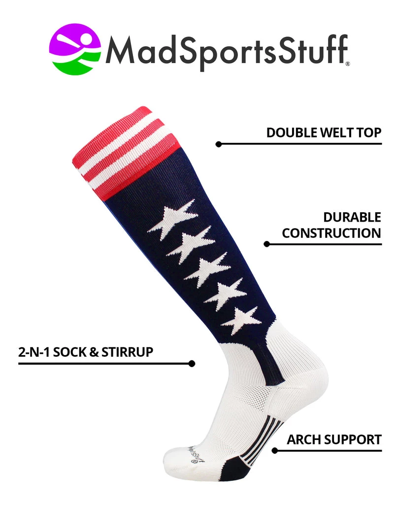 USA Flag Baseball Patriotic Stirrups Socks with Stars and Stripes. A classic USA stars and stripe stirrup pattern knit into a sock. Made for boys or girls for baseball, softball, fastpitch or tee ball! Our USA flag baseball stirrups are made with love in the USA.