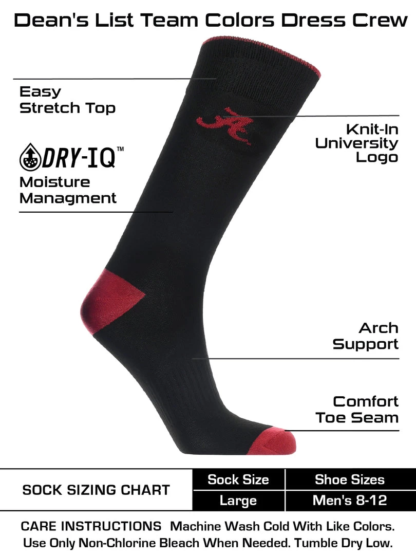 TCK Dean’s List crew length dress socks feature a smooth flat-knit fabric and classic team color styling. Perfect for lace-ups or loafers, these socks let you maintain a professional look while you support your school. Offering softness, comfort, and durability these high quality University of Alabama Crimson Tide socks are an ideal gift for Father’s Day, birthdays, stocking stuffers or going back to school. Made up of 97% Polyester, 3% Spandex. Roll Tide!