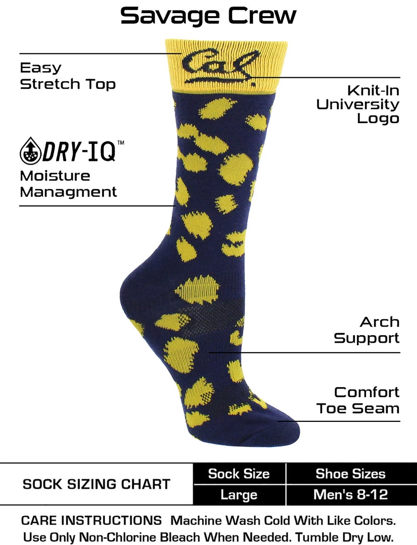 Show your school spirit in the office, at a wedding, at the football stadium or basketball game. Soft and durable, these socks let you maintain a professional look while you support your school. Offering comfort, breathability, performance, and durability these high quality University of California Berkeley Bears socks are an ideal gift for birthdays, stocking stuffers, Mother’s Day or going back to school. TCK Womens Savage Socks are made up of 97% Polyester, 3% Spandex. Go Bears!