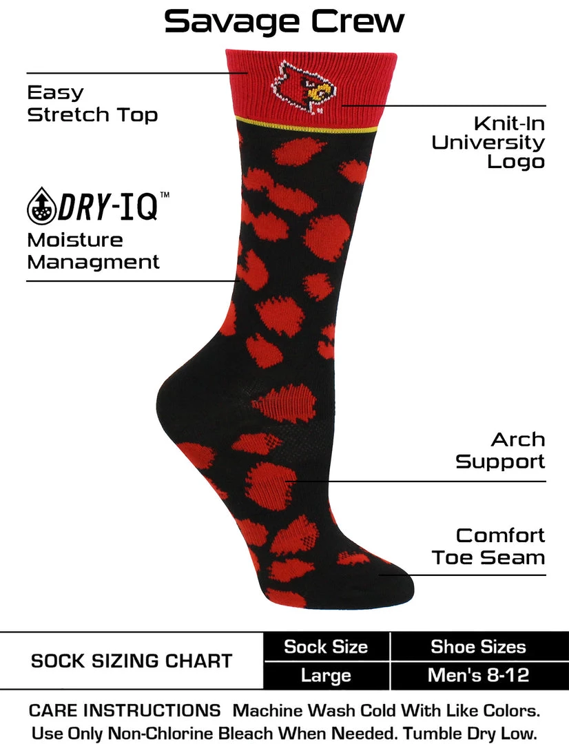 - COMFORT AND BREATHABILITY: These premium quality UofL Cardinals leopard print casual socks provide soft comfort. Moisture management technology pulls moisture and sweat away from skin.