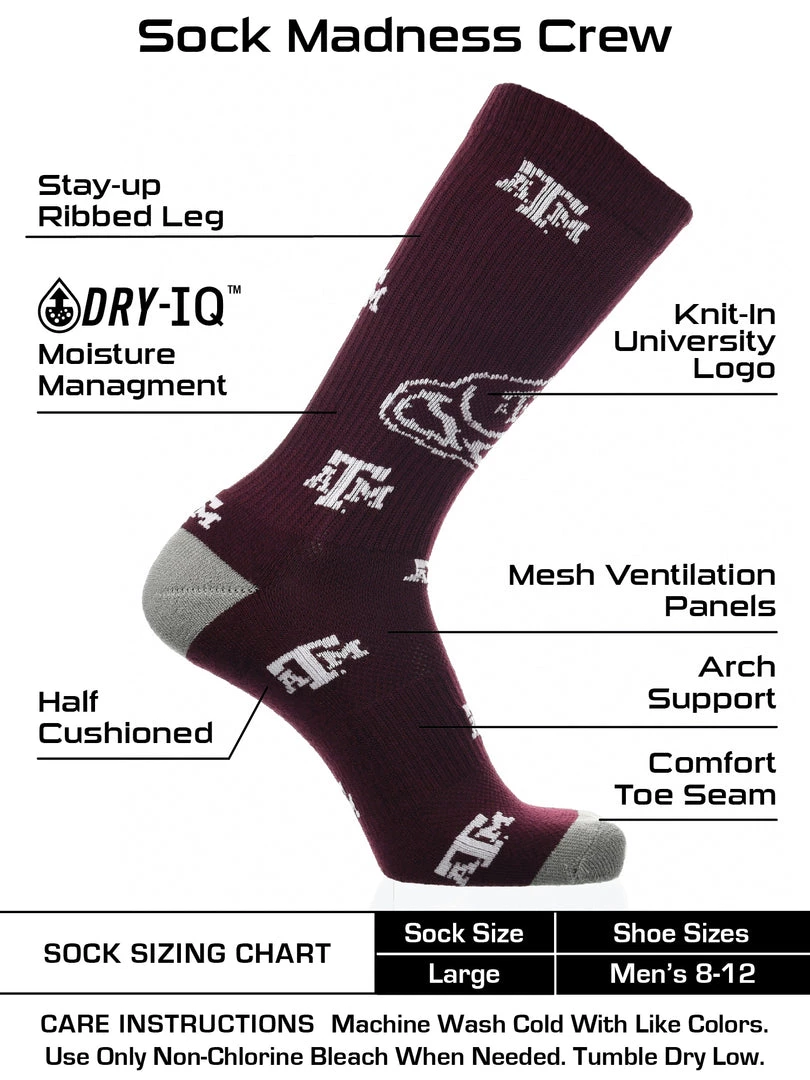 Wear your loud and proud school pride on your feet and be ready for even the most strenuous activities. Perfect with sneakers and slides, these socks let you be athletic ready while you support your school. Offering comfort, breathability, performance, and durability these high quality Texas A&M Aggies socks are an ideal gift for Father’s Day, birthdays, stocking stuffers or going back to school. TCK Sock Madness Crew Socks are made up of 94% Polyester, 4% Rubber, 2% Spandex. Gig ‘Em Aggies!