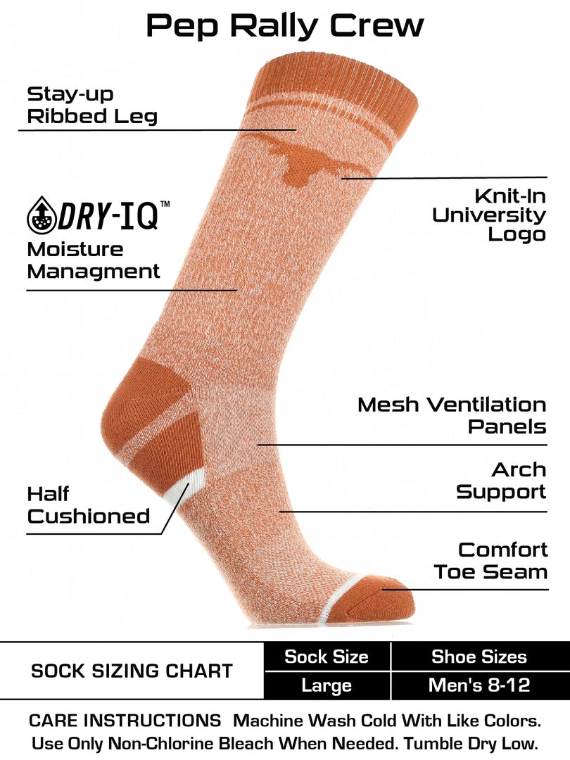 - COMFORT AND BREATHABILITY: These premium quality Texas Longhorns socks provide soft comfort. Mesh panel ventillation above the foot allows for proper air flow. Keeping the feet dry. Moisture management technology pulls away moisture from skin.