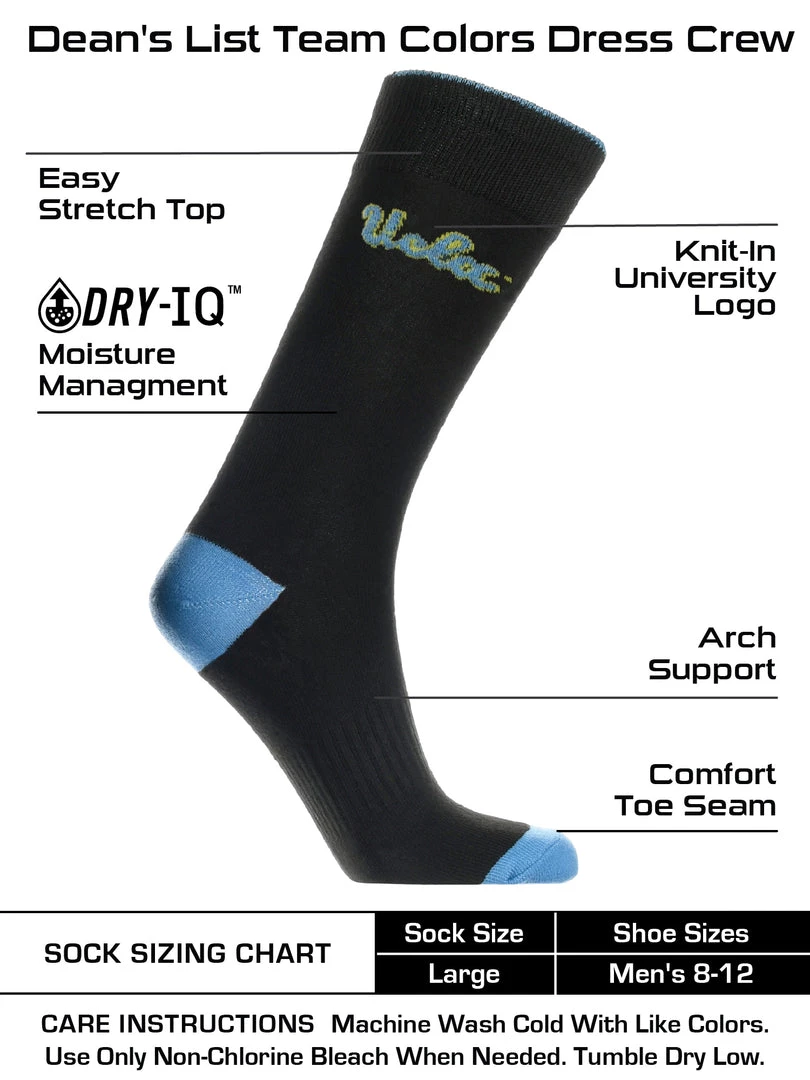 TCK Dean’s List crew length dress socks feature a smooth flat-knit fabric and classic team color styling. Perfect for lace-ups or loafers, these socks let you maintain a professional look while you support your school. Offering softness, comfort, and durability these high quality UCLA Bruins socks are an ideal gift for Father’s Day, birthdays, stocking stuffers or going back to school. Made up of 97% Polyester, 3% Spandex. Go Bruins!