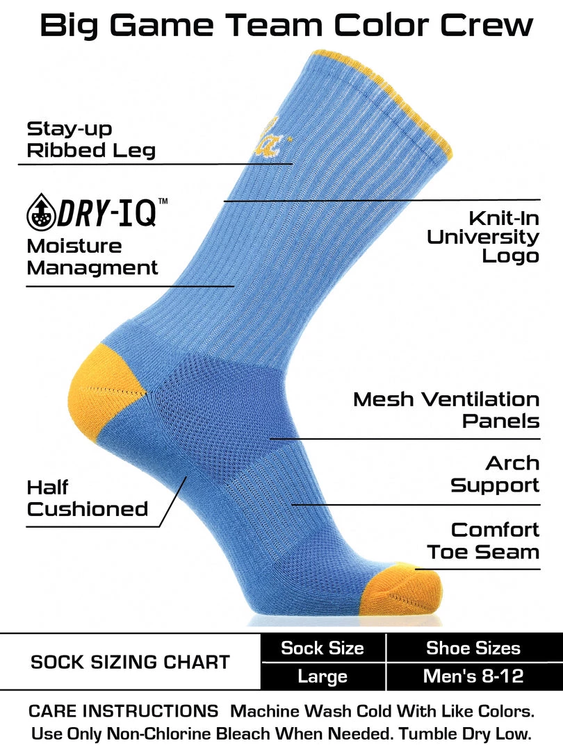 - COMFORT AND BREATHABILITY: These premium quality UCLA socks provide soft comfort. Mesh panel ventillation above the foot allows for proper air flow. Moisture management technology pulls away moisture from skin, keeping your feet cool and dry.