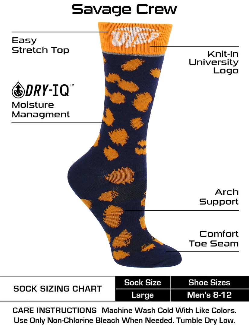 Show your school spirit in the office, at a wedding, at the football stadium or basketball game. Soft and durable, these socks let you maintain a professional look while you support your school. Offering comfort, breathability, performance, and durability these high quality University of Texas El Paso Miners socks are an ideal gift for birthdays, stocking stuffers, Mother’s Day or going back to school. TCK Womens Savage Socks are made up of 97% Polyester, 3% Spandex. Go Miners!