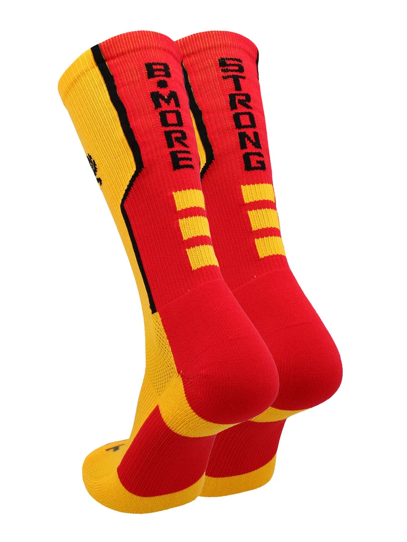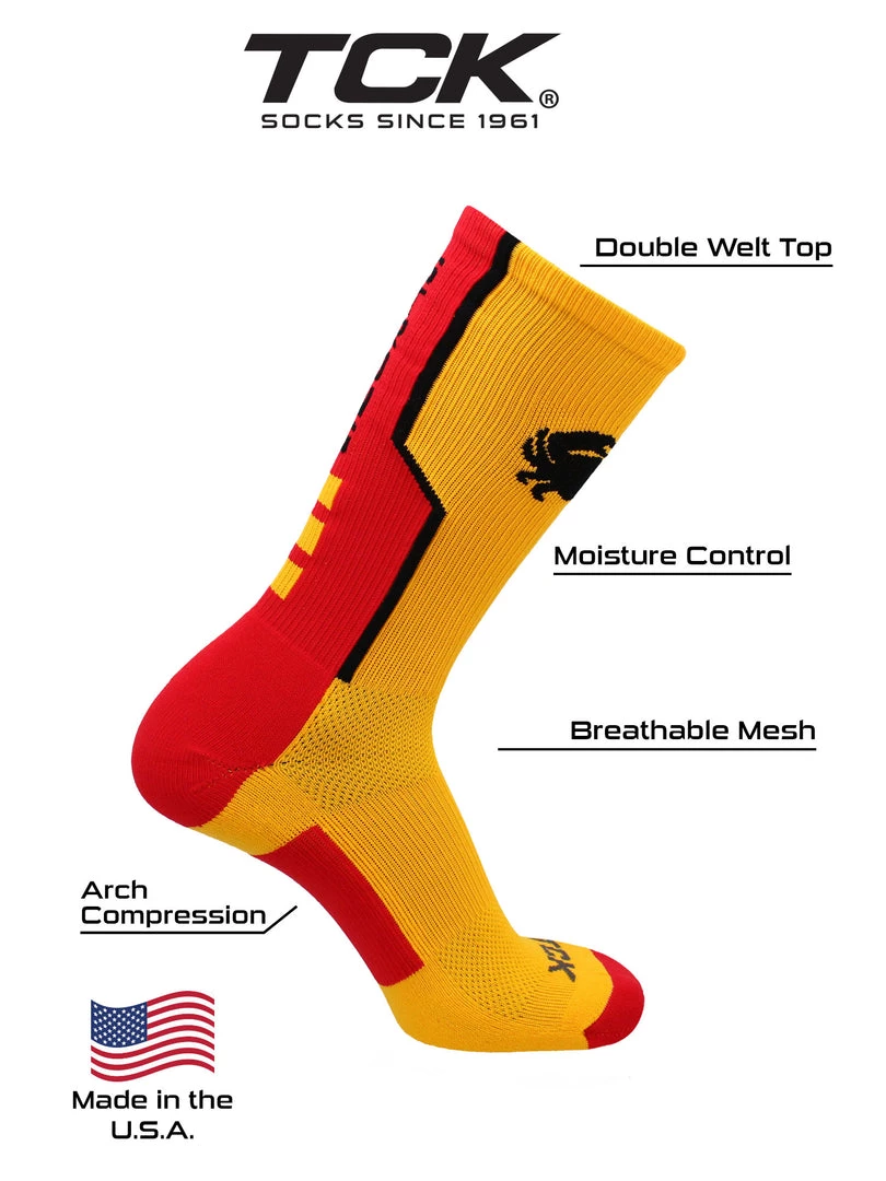 TCK Baltimore Strong Crew Socks are a must have for your next game or practice. Featuring moisture control yarns, breathable mesh, ergonomic cushion, arch compression, and a double welt top, they provide maximum athletic performance. These socks are suitable for both men and women. Our Perimeter custom crew socks are great for basketball, football, lacrosse, wrestling, tennis, volleyball and more! Founded in 1961, TCK socks are manufactured with pride in the USA.