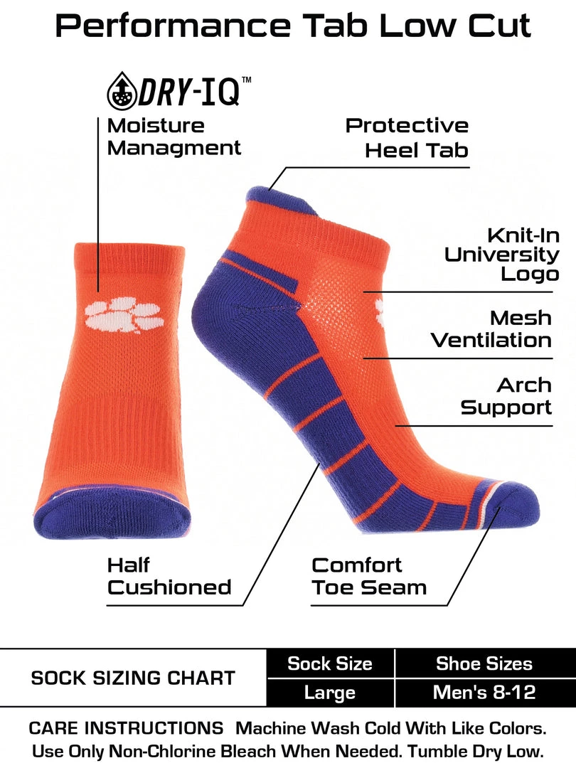 TCK No Show Performance Low Cut Socks are the perfect athletic ankle sock. Wear these to the tailgate party, working out, or lounge around the house. Offering comfort, breathability, performance, and durability these high quality Clemson University socks are an ideal gift for Father’s Day, birthdays, stocking stuffers or going back to school. Made of 97% Polyester, 3% Spandex. Gear up for the big game! Go Tigers!