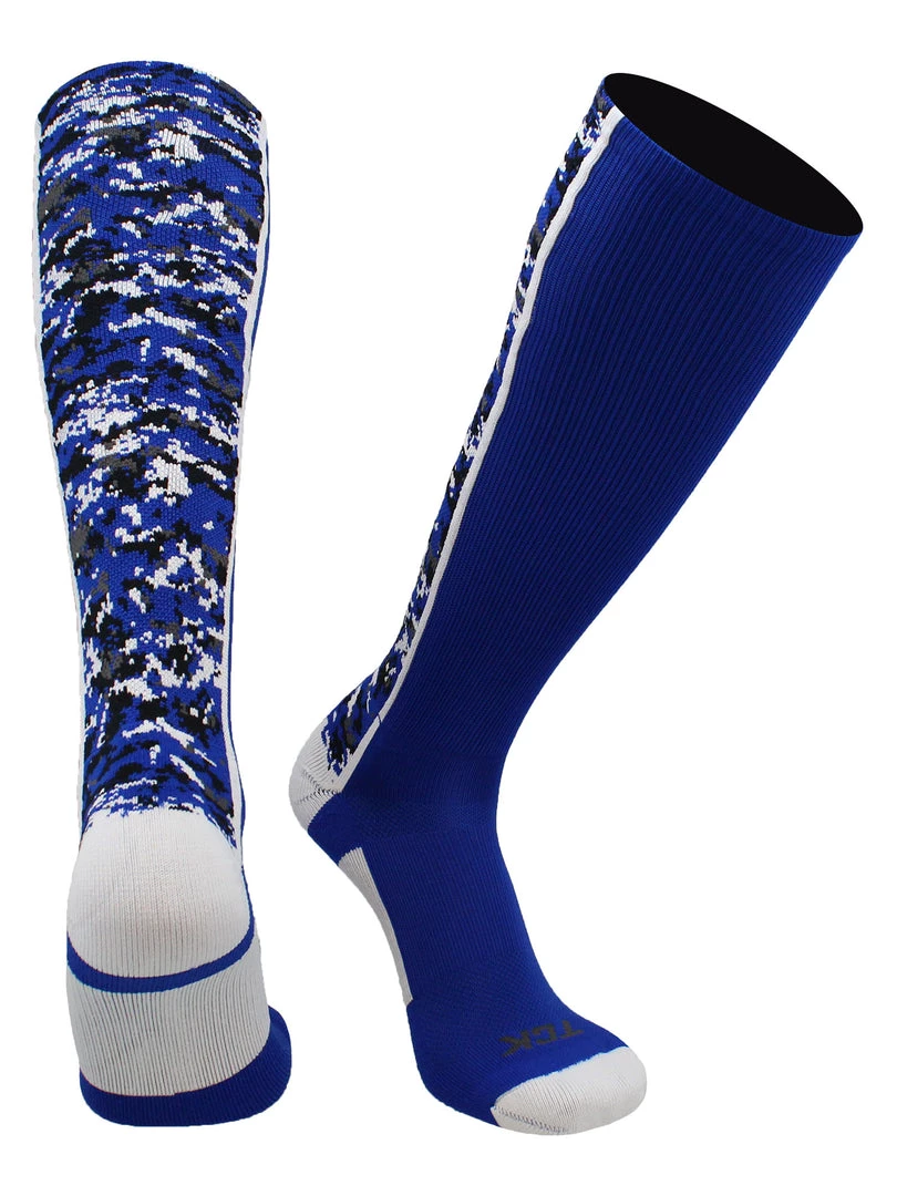 TCK Digital Camo Over the Calf Socks (OTC) are a must have to your next game, outing, or practice. Featuring moisture control yarns, breathable mesh, ergonomic cushion, arch compression, & a double welt top. Great for basketball, football, lacrosse, wrestling, field hockey, volleyball & more! This sock is designed to hold up on the court or field. Made in the USA with high quality materials. Created with 64% Polypropylene, 27% Nylon, 7% Elastic, 2% Spandex.