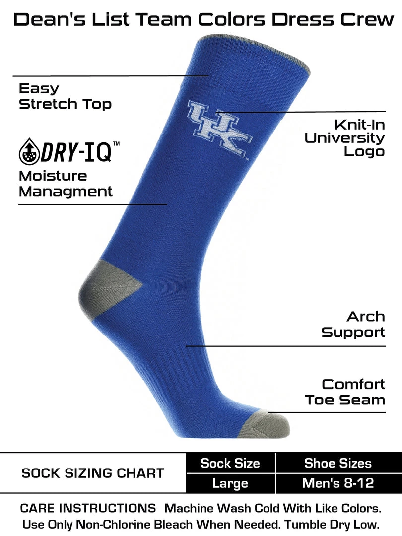 TCK Dean’s List crew length dress socks feature a smooth flat-knit fabric and classic team color styling. Perfect for lace-ups or loafers, these socks let you maintain a professional look while you support your school. Offering softness, comfort, and durability these high quality University of Kentucky Wildcats socks are an ideal gift for Father’s Day, birthdays, stocking stuffers or going back to school. Made up of 97% Polyester, 3% Spandex. Go Big Blue!