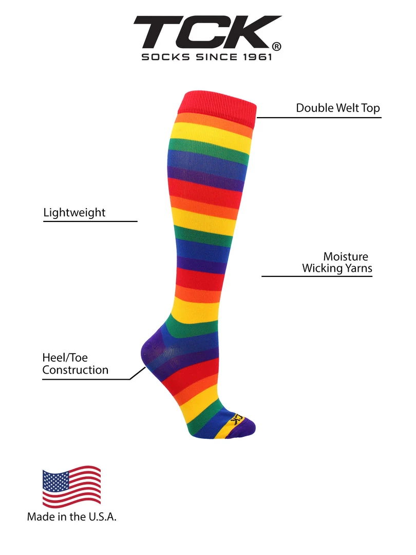 TCK Krazisox Rainbow Socks are great for team sports. A fun & comfortable lightweight design featuring moisture wicking yarns, heel/toe construction & a double welt top to hold the sock in place. Ideal for softball, volleyball, field hockey, soccer, cheer, kickball, lacrosse, and more! These socks are suitable for both boys and girls and come in youth and adult sizes. Founded in 1961, TCK socks are manufactured with pride in the USA.