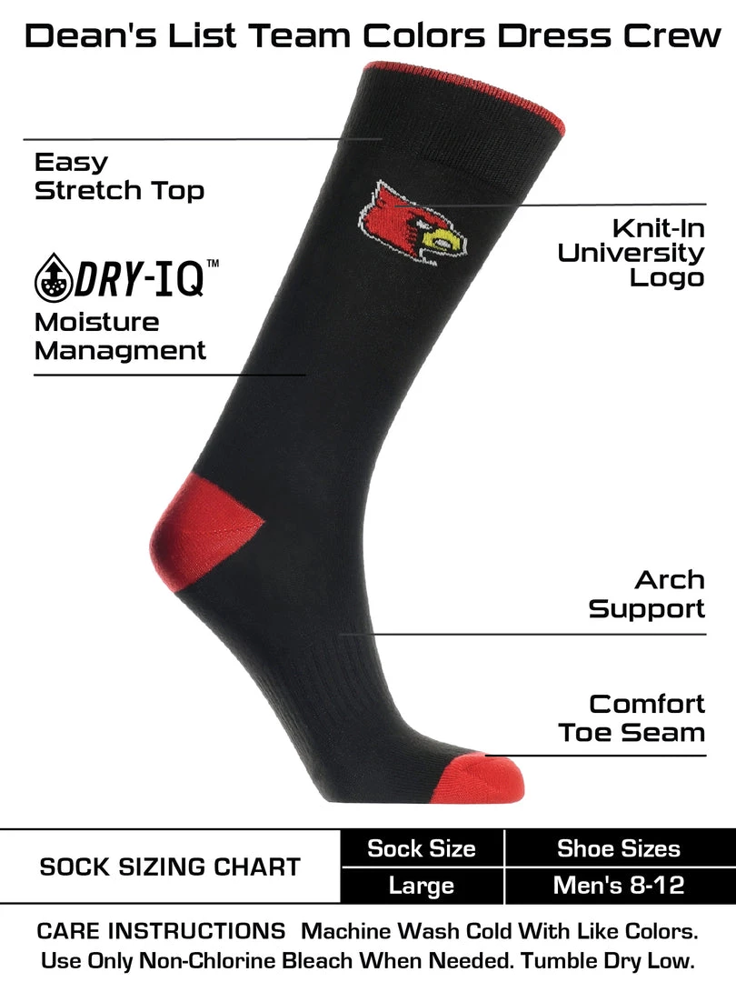 TCK Dean’s List crew length dress socks feature a smooth flat-knit fabric and classic team color styling. Perfect for lace-ups or loafers, these socks let you maintain a professional look while you support your school. Offering softness, comfort, and durability these high quality University of Louisville Cardinals socks are an ideal gift for Father’s Day, birthdays, stocking stuffers or going back to school. Made up of 97% Polyester, 3% Spandex. Go Cards!