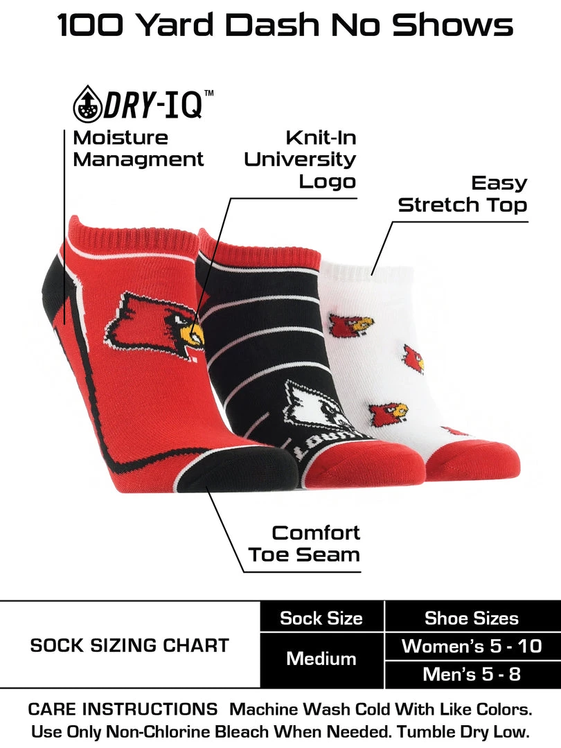 TCK Full Field, No Show Socks come with 3 pairs of comfy socks. Get ready to cheer on your favorite team during the season! Wear these to the tailgate party, working out, or lounge around the house.Offering comfort, breathability, and durability these high quality University of Louisville Cardinals socks are an ideal gift for birthdays, stocking stuffers or going back to school. Made of 97% Polyester, 3% Spandex. Gear up for the big game! Go Cards!