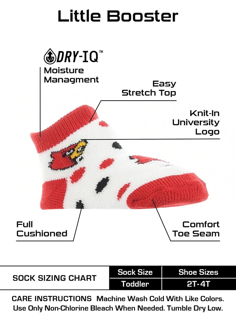 TCK Little Fan Low Cut Toddler Socks are soft and comfy. Get the little ones ready for gameday. If you are headed to the tailgate, game or cheering on the team from home, show off the school spirit! Offering an easy stretch top, soft comfortbale feel, and durability these high quality University of Louisville Cardinals socks are an ideal gift for birthdays, stocking stuffers or baby showers. Toddler Size 2T-4T. Made of 98% Polyester, 2% Spandex. Go Cards!