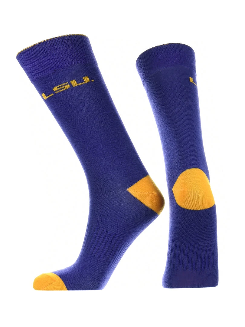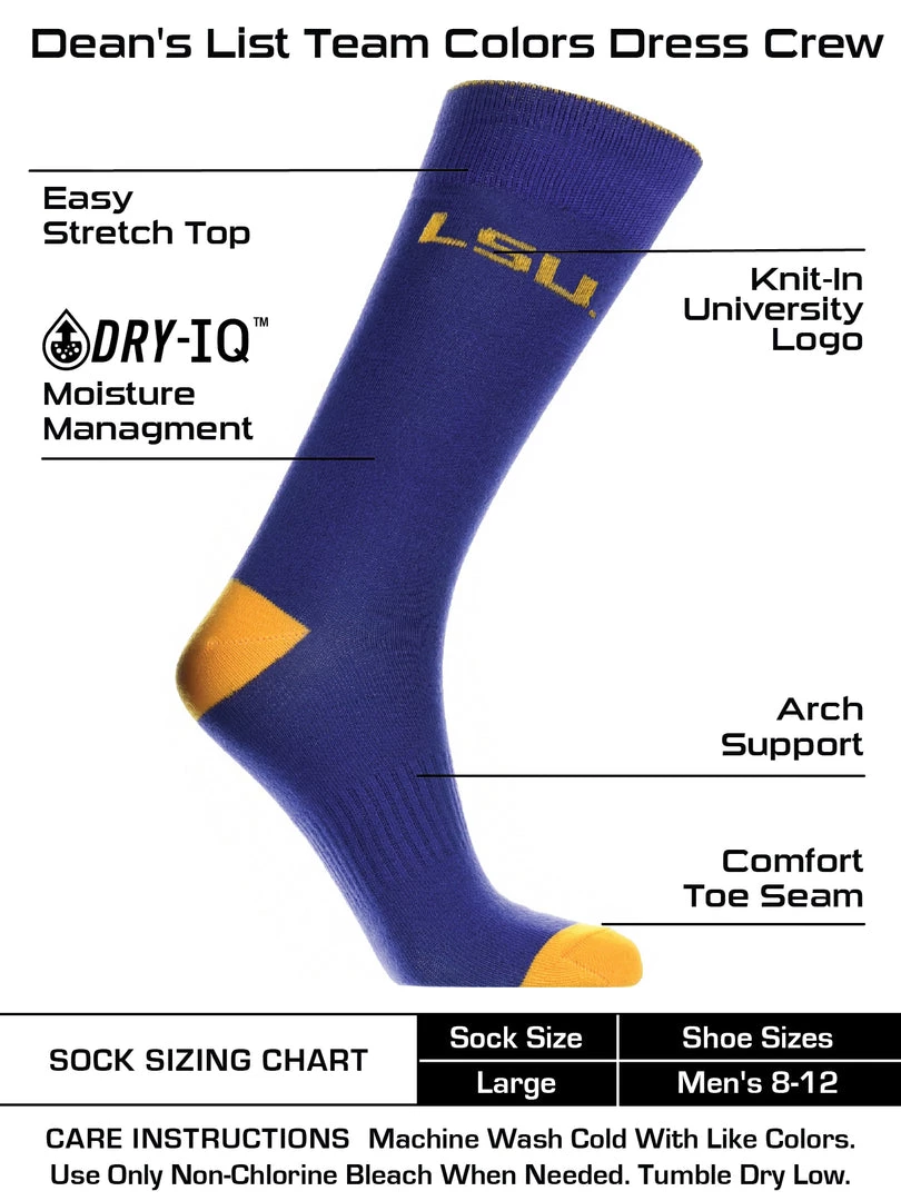 TCK Dean’s List crew length dress socks feature a smooth flat-knit fabric and classic team color styling. Perfect for lace-ups or loafers, these socks let you maintain a professional look while you support your school. Offering softness, comfort, and durability these high quality Louisana State University Tigers socks are an ideal gift for Father’s Day, birthdays, stocking stuffers or going back to school. Made up of 97% Polyester, 3% Spandex. Go Tigers!